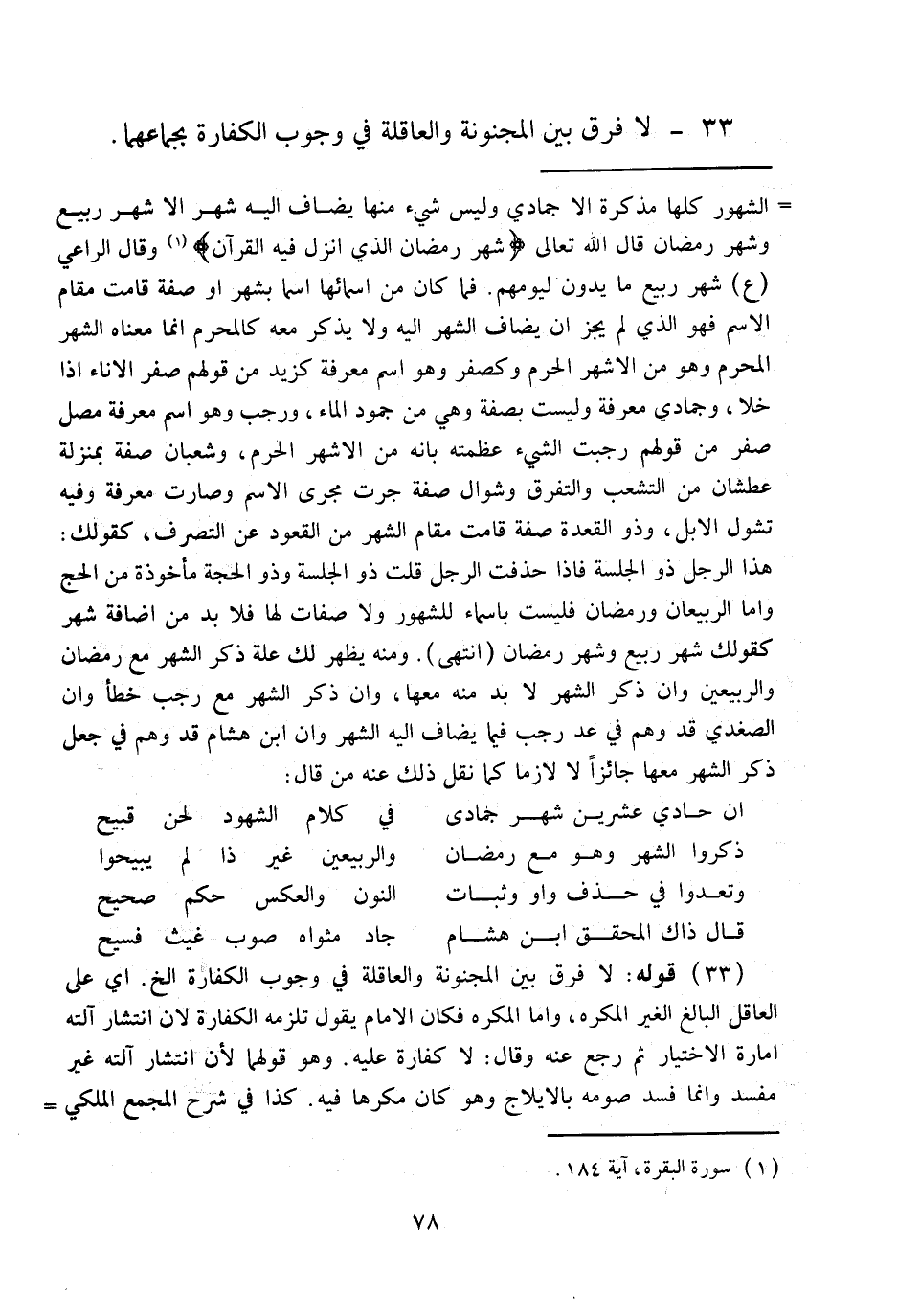 (33) قَوْلُهُ: لَا فَرْقَ بَيْنَ الْمَجْنُونَةِ وَالْعَاقِلَةِ فِي وُجُوبِ الْكَفَّارَةِ إلَخْ. أَيْ عَلَى الْعَاقِلِ الْبَالِغِ الْغَيْرِ الْمُكْرَهِ، وَأَمَّا الْمُكْرَهُ فَكَانَ الْإِمَامُ يَقُولُ تَلْزَمُهُ الْكَفَّارَةُ لِأَنَّ انْتِشَارَ آلَتِهِ إمَارَةُ الِاخْتِيَارِ ثُمَّ رَجَعَ عَنْهُ وَقَالَ: لَا كَفَّارَةَ عَلَيْهِ. وَهُوَ قَوْلُهُمَا لِأَنَّ انْتِشَارَ آلَتِهِ غَيْرُ مُفْسِدٍ وَإِنَّمَا فَسَدَ صَوْمُهُ بِالْإِيلَاجِ وَهُوَ كَانَ مُكْرَهًا فِيهِ. كَذَا فِي شَرْحِ الْمَجْمَعِ الْمَلَكِيِّ