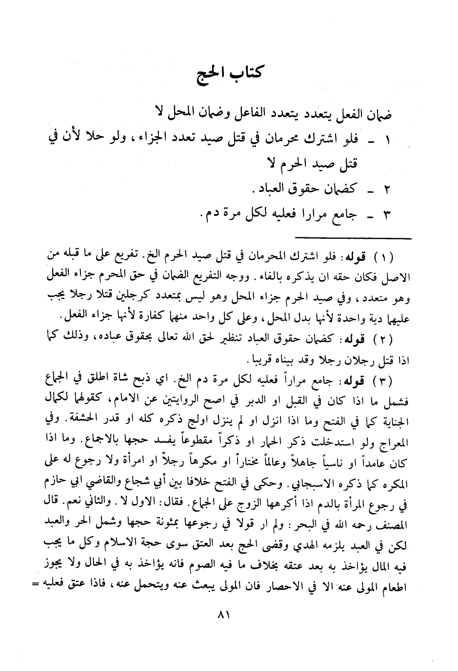 كِتَابُ الْحَجِّ ضَمَانُ الْفِعْلِ يَتَعَدَّدُ بِتَعَدُّدِ الْفَاعِلِ وَضَمَانُ الْمَحَلِّ لَا 1 - فَلَوْ اشْتَرَكَ مُحْرِمَانِ فِي قَتْلِ صَيْدٍ تَعَدَّدَ الْجَزَاءُ، وَلَوْ حَلَّا لِأَنَّ فِي قَتْلِ صَيْدِ الْحَرَمِ لَا 2 - كَضَمَانِ حُقُوقِ الْعِبَادِ