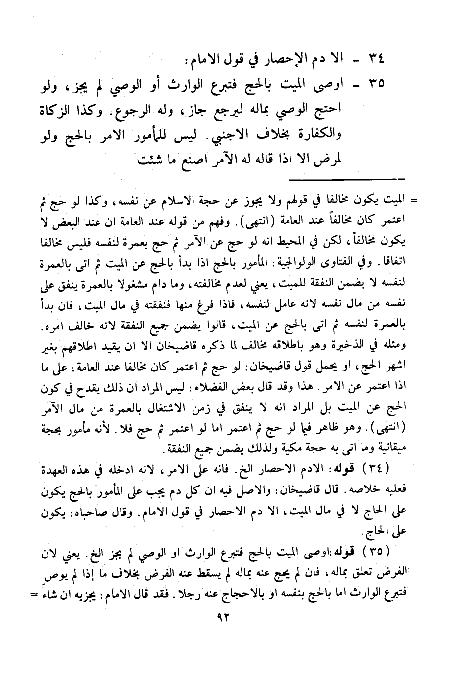 35 - أَوْصَى الْمَيِّتَ بِالْحَجِّ فَتَبَرَّعَ الْوَارِثُ أَوْ الْوَصِيُّ لَمْ يَجُزْ، وَلَوْ احْتَجَّ الْوَصِيُّ بِمَالٍ لِيَرْجِعَ جَازَ، وَلَهُ الرُّجُوعُ. وَكَذَا الزَّكَاةُ وَالْكَفَّارَةُ بِخِلَافِ الْأَجْنَبِيِّ