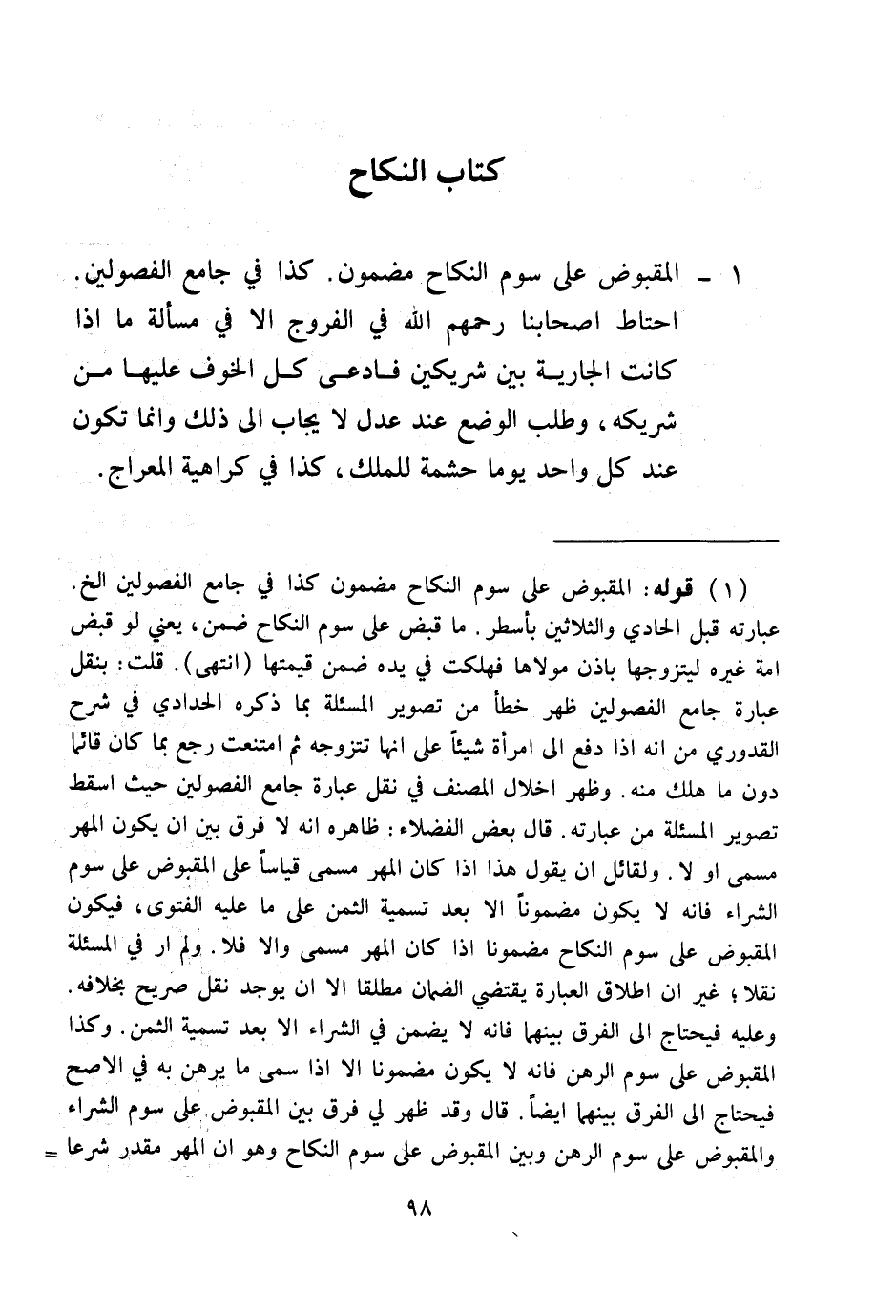 كِتَابُ النِّكَاحِ 1 - الْمَقْبُوضُ عَلَى سَوْمِ النِّكَاحِ مَضْمُونٌ. كَذَا فِي جَامِعِ الْفُصُولَيْنِ. احْتَاطَ أَصْحَابُنَا - رَحِمَهُمُ اللَّهُ - فِي الْفُرُوجِ إلَّا فِي مَسْأَلَةِ مَا إذَا كَانَتْ الْجَارِيَةُ بَيْنَ شَرِيكَيْنِ فَادَّعَى كُلٌّ الْخَوْفَ عَلَيْهَا مِنْ شَرِيكِهِ، وَطَلَبَ الْوَضْعَ عِنْدَ عَدْلٍ لَا يُجَابُ إلَى ذَلِكَ وَإِنَّمَا تَكُونُ عِنْدَ كُلِّ وَاحِدٍ يَوْمًا حِشْمَةً لِلْمِلْكِ، كَذَا فِي كَرَاهِيَةِ الْمِعْرَاجِ