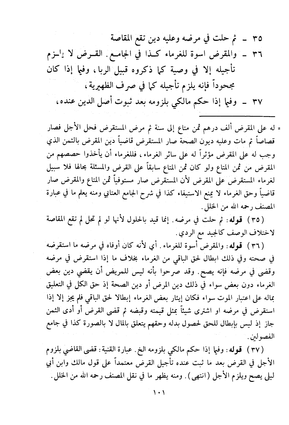 ثُمَّ حَلَّتْ فِي مَرَضِهِ وَعَلَيْهِ دَيْنٌ تَقَعُ الْمُقَاصَّةُ. 36 - وَالْمُقْرِضُ أُسْوَةٌ لِلْغُرَمَاءِ كَذَا فِي الْجَامِعِ.