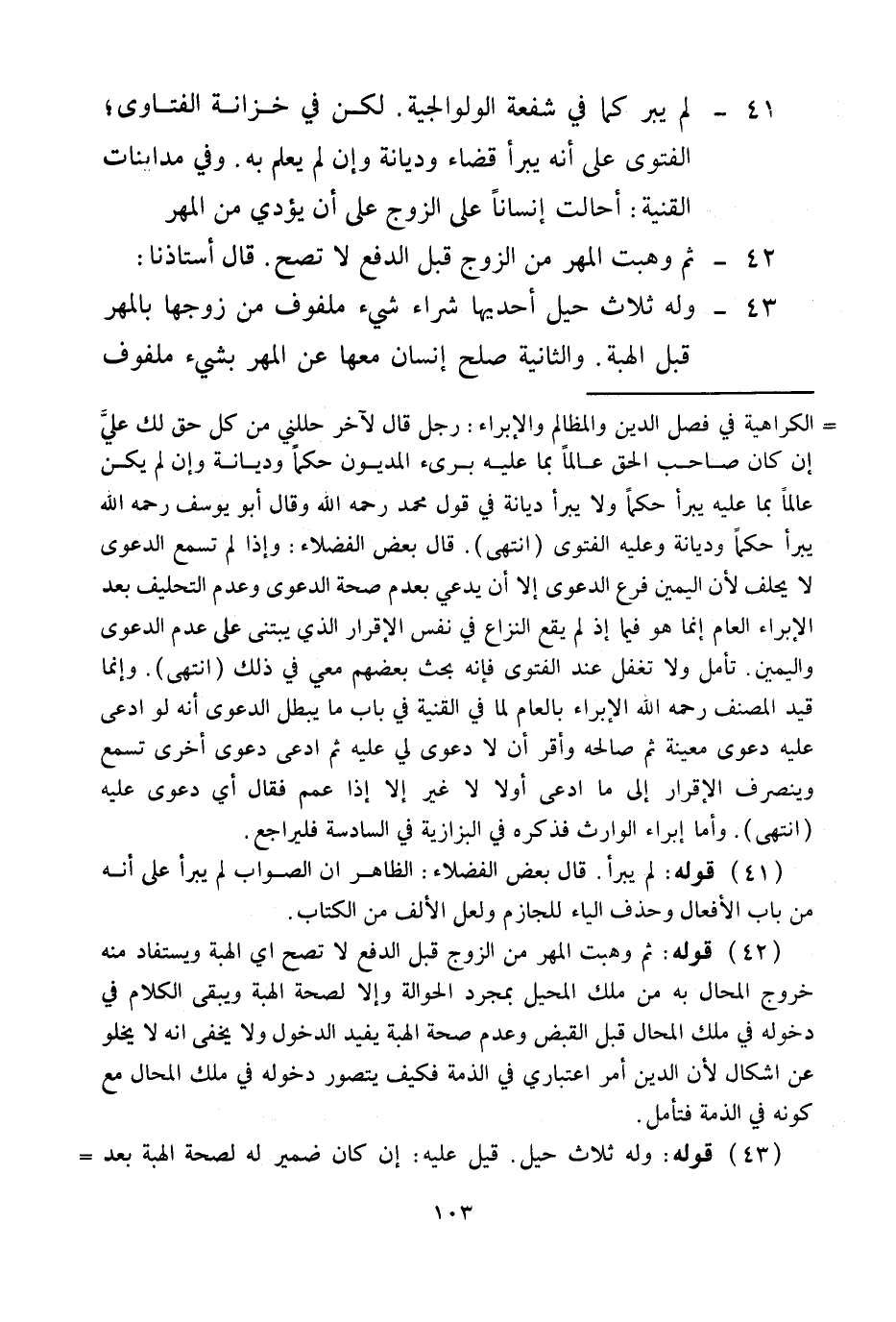 (42) قَوْلُهُ: ثُمَّ وَهَبَتْ الْمَهْرَ مِنْ الزَّوْجِ قَبْلَ الدَّفْعِ لَا تَصِحُّ أَيْ الْهِبَةُ وَيُسْتَفَادُ مِنْهُ خُرُوجُ الْمُحَالِ بِهِ مِنْ مِلْكِ الْمُحِيلِ بِمُجَرَّدِ الْحَوَالَةِ وَإِلَّا لِصِحَّةِ الْهِبَةِ وَيَبْقَى الْكَلَامُ فِي دُخُولِهِ فِي مِلْكِ الْمُحَالِ قَبْلَ الْقَبْضِ، وَعَدَمُ صِحَّةِ الْهِبَةِ يُفِيدُ الدُّخُولَ وَلَا يَخْفَى أَنَّهُ لَا يَخْلُو عَنْ إشْكَالٍ؛ لِأَنَّ الدَّيْنَ أَمْرٌ اعْتِبَارِيٌّ فِي الذِّمَّةِ فَكَيْفَ يُتَصَوَّرُ دُخُولُهُ فِي مِلْكِ الْمُحَالِ مَعَ كَوْنِهِ فِي الذِّمَّةِ فَتَأَمَّلْ.