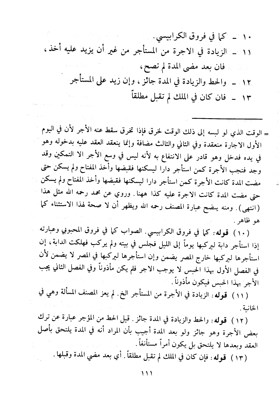 11 - الزِّيَادَةُ فِي الْأُجْرَةِ مِنْ الْمُسْتَأْجِرِ مِنْ غَيْرِ أَنْ يَزِيدَ عَلَيْهِ أَخْذٌ، فَإِنْ بَعْدَ مُضِيِّ الْمُدَّةِ لَمْ تَصِحَّ، 12 - وَالْحَطُّ وَالزِّيَادَةُ فِي الْمُدَّةِ جَائِزٌ، وَإِنْ زِيدَ عَلَى الْمُسْتَأْجِرِ 13 - فَإِنْ كَانَ فِي الْمِلْكِ لَمْ تُقْبَلْ مُطْلَقًا
