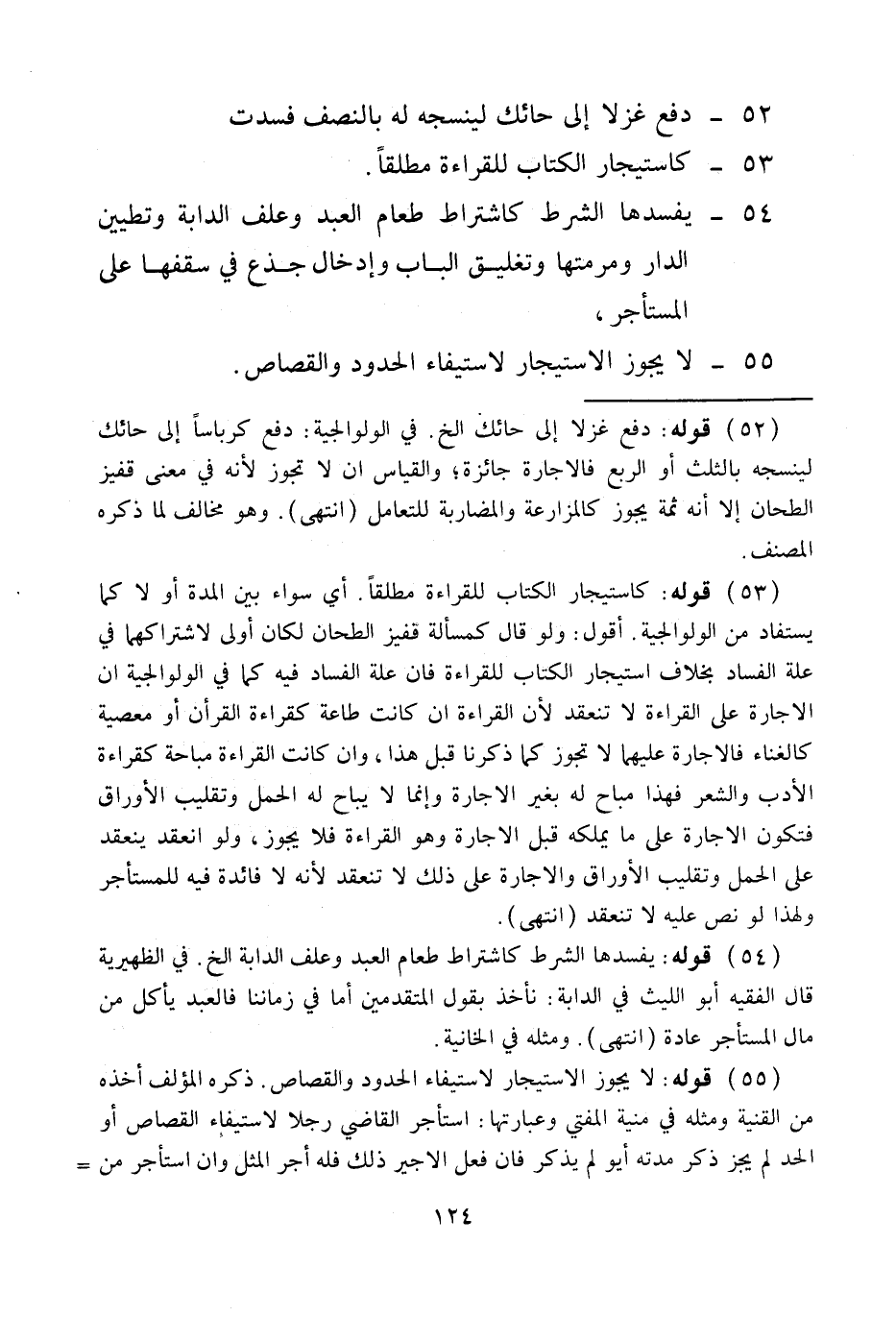 دَفَعَ غَزْلًا إلَى حَائِكٍ لِيَنْسِجَهُ لَهُ بِالنِّصْفِ فَسَدَتْ 53 - كَاسْتِئْجَارِ الْكِتَابِ لِلْقِرَاءَةِ مُطْلَقًا. 54 -