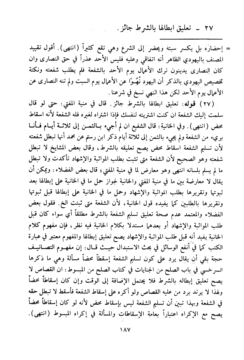 (27) قَوْلُهُ: تَعْلِيقُ إبْطَالِهَا بِالشَّرْطِ جَائِزٌ.