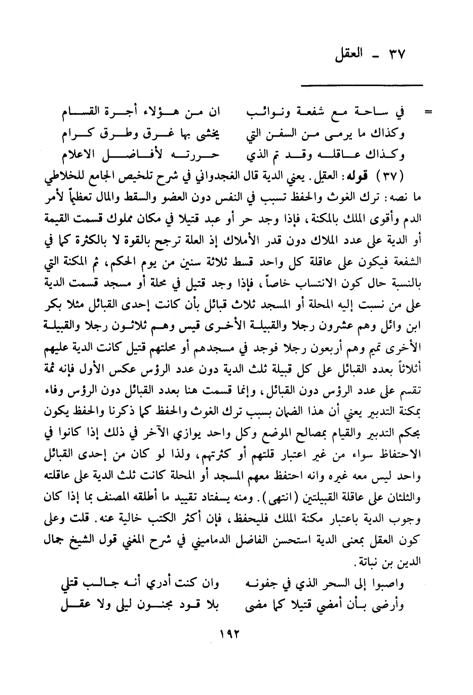 قُلْت: وَعَلَى كَوْنِ الْعَقْلِ بِمَعْنَى الدِّيَةِ اسْتَحْسَنَ الْفَاضِلُ الدَّمَامِينِيُّ فِي شَرْحِ الْمُغْنِي قَوْلَ الشَّيْخِ جَمَالِ الدِّينِ بْنِ نَبَاتَةَ.