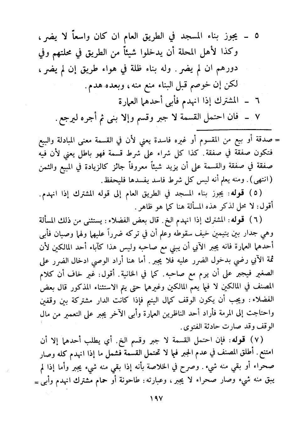 6 - الْمُشْتَرَكُ إذَا انْهَدَمَ فَأَبَى أَحَدُهُمَا الْعِمَارَةَ 7 - فَإِنْ احْتَمَلَ الْقِسْمَةَ لَا جَبْرٍ وَقُسِّمَ وَإِلَّا بَنَى ثُمَّ أَجَّرَهُ لِيَرْجِعَ.