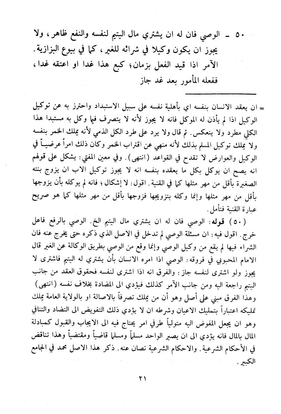 أَقُولُ فِيهِ: إنَّ مَسْأَلَةَ الْوَصِيِّ لَمْ تَدْخُلْ فِي الْأَصْلِ الَّذِي ذَكَرَهُ حَتَّى يَخْرُجَ عَنْهُ فَإِنَّ الشِّرَاءَ فِيهَا لَمْ يَقَعْ مِنْ وَكِيلِ الْوَصِيِّ وَإِنَّمَا وَقَعَ مِنْ الْوَصِيِّ بِطَرِيقِ الْوَكَالَةِ عَنْ الْغَيْرِ قَالَ الْإِمَامُ الْمَحْبُوبِيُّ فِي فُرُوقِهِ الْوَصِيُّ إذَا أَمَرَهُ الْإِنْسَانُ بِأَنْ يَشْتَرِيَ لَهُ مِنْ الْيَتِيمِ فَاشْتَرَى لَا يَجُوزُ وَلَوْ اشْتَرَى لِنَفْسِهِ جَازَ: وَالْفَرْقُ أَنَّهُ إذَا اشْتَرَى لِنَفْسِهِ فَحُقُوقُ الْعَقْدِ مِنْ جَانِبِ الْيَتِيمِ رَاجِعَةٌ إلَيْهِ وَمَنْ جَانِبِ الْآمِرِ كَذَلِكَ فَيُؤَدِّي إلَى الْمُضَادَّةِ بِخِلَافِ نَفْسِهِ (انْتَهَى) وَهَذَا الْفَرْقُ مَبْنِيٌّ عَلَى أَصْلٍ وَهُوَ أَنَّ مَنْ يَمْلِكُ تَصَرُّفًا بِالْأَصَالَةِ أَوْ بِالْوِلَايَةِ الْعَامَّةِ يَمْلِكُ تَمْلِيكَهُ اعْتِبَارًا بِتَمْلِيكِ الْأَعْيَانِ وَشَرْطُهُ أَنْ لَا يُؤَدِّيَ ذَلِكَ التَّفْوِيضُ إلَى التَّضَادِّ وَالتَّنَافِي وَهُوَ أَنْ يُجْعَلَ الْمُفَوَّضُ إلَيْهِ مُتَوَلِّيًا طَرَفَيْ أَمْرٍ يُحْتَاجُ فِيهِ إلَى الْإِيجَابِ وَالْقَبُولِ كَمُبَادَلَةِ الْمَالِ بِالْمَالِ فَإِنَّهُ يُؤَدِّي إلَى أَنْ يَصِيرَ الْوَاحِدُ مُسَلِّمًا وَمُسَلَّمًا قَاضِيًا وَمُقْتَضِيًا وَهَذَا تَنَاقُضٌ فِي الْأَحْكَامِ الشَّرْعِيَّةِ.