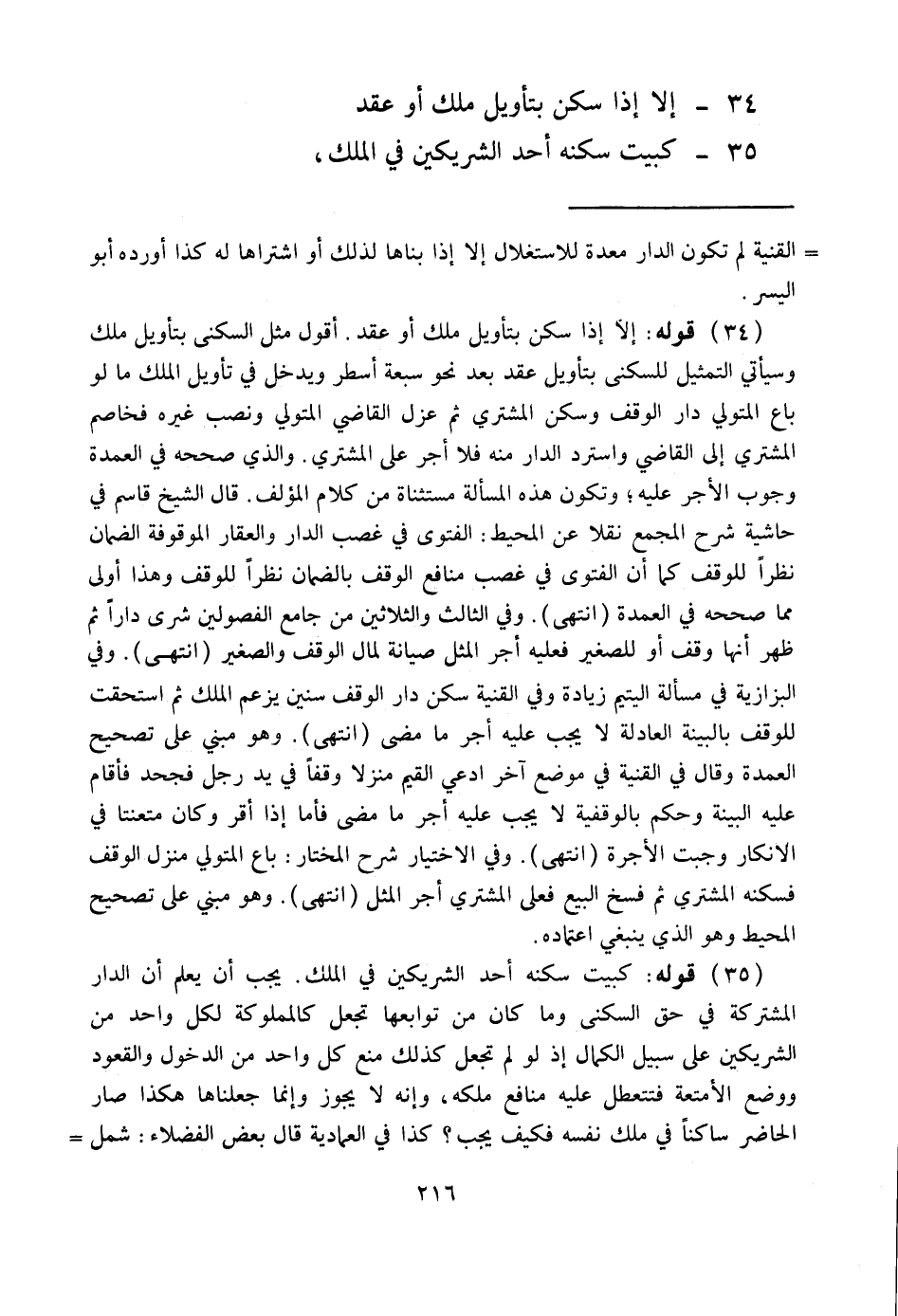 إلَّا إذَا سَكَنَ بِتَأْوِيلِ مِلْكٍ أَوْ عَقْدٍ 35 - كَبَيْتٍ سَكَنَهُ أَحَدُ الشَّرِيكَيْنِ فِي الْمِلْكِ