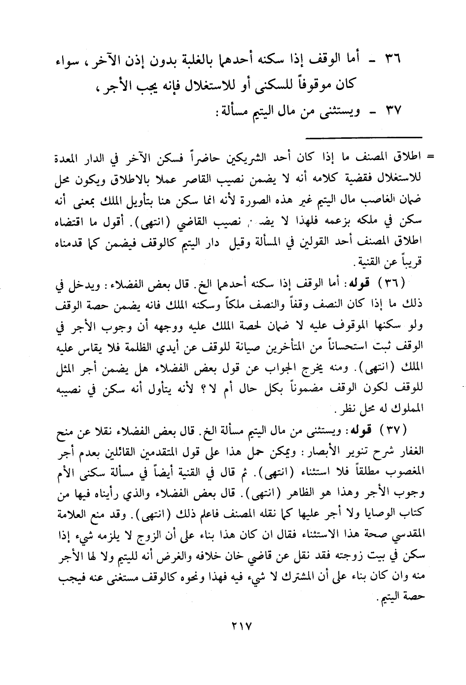 أَمَّا الْوَقْفُ إذَا سَكَنَهُ أَحَدُهُمَا بِالْغَلَبَةِ بِدُونِ إذْنِ الْآخَرِ، سَوَاءٌ كَانَ مَوْقُوفًا لِلسُّكْنَى أَوْ لِلِاسْتِغْلَالِ فَإِنَّهُ يَجِبُ الْأَجْرُ، 37 - وَيُسْتَثْنَى مِنْ مَالِ الْيَتِيمِ مَسْأَلَةٌ:
