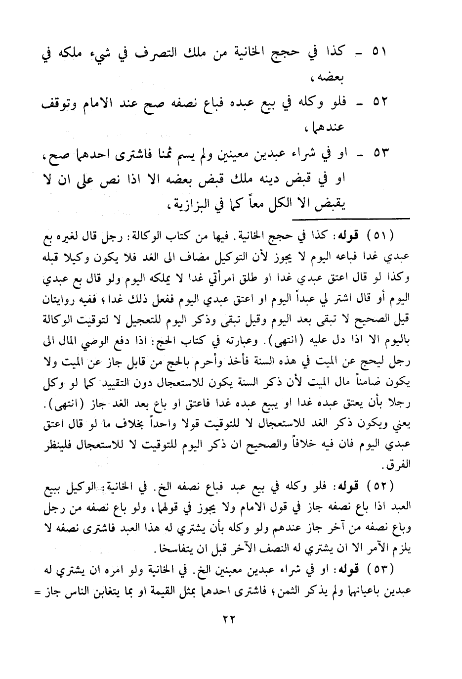 52 - فَلَوْ وَكَّلَهُ فِي بَيْعِ عَبْدِهِ فَبَاعَ نِصْفَهُ صَحَّ عِنْدَ الْإِمَامِ وَتَوَقَّفَ عِنْدَهُمَا، 53 - أَوْ فِي شِرَاءِ عَبْدَيْنِ مُعَيَّنَيْنِ وَلَمْ يُسَمِّ ثَمَنًا فَاشْتَرَى أَحَدَهُمَا صَحَّ، أَوْ فِي قَبْضِ دَيْنِهِ مَلَكَ قَبْضَ بَعْضِهِ إلَّا إذَا نَصَّ عَلَى أَنْ لَا يَقْبِضَ إلَّا الْكُلَّ مَعًا كَمَا فِي الْبَزَّازِيَّةِ
