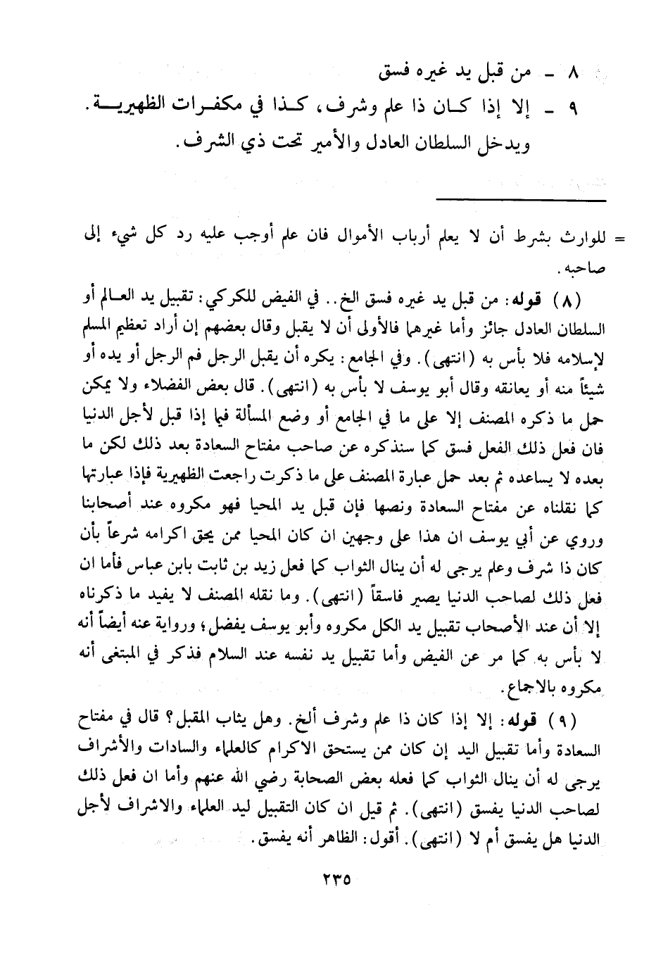 مَنْ قَبَّلَ يَدَ غَيْرِهِ فَسَقَ 9 - إلَّا إذَا كَانَ ذَا عِلْمٍ وَشَرَفٍ، كَذَا فِي مُكَفِّرَاتِ الظَّهِيرِيَّةِ.
