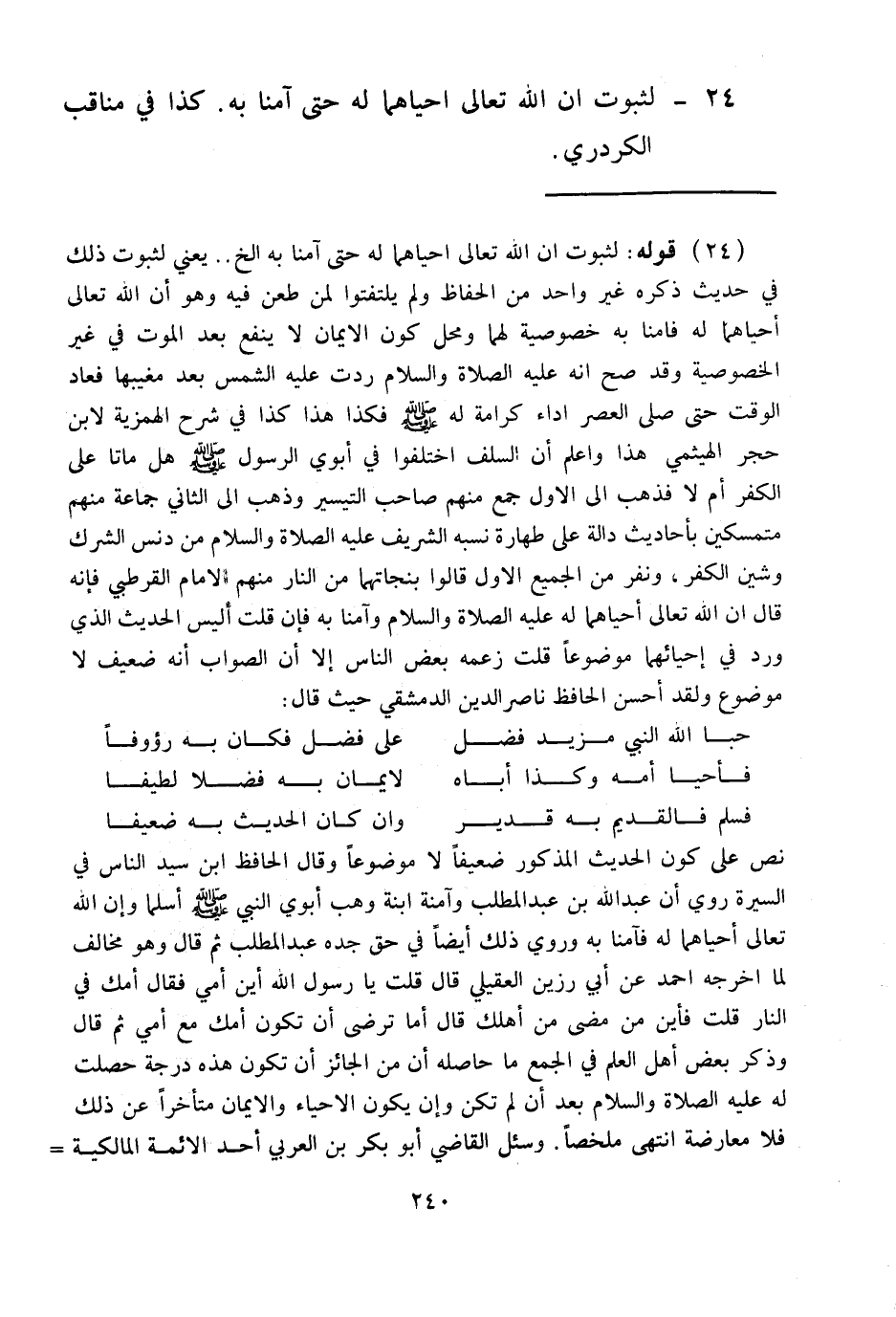 فَأَحْيَا أُمَّهُ وَكَذَا أَبَاهُ ... لِإِيمَانٍ بِهِ فَضْلًا لَطِيفَا