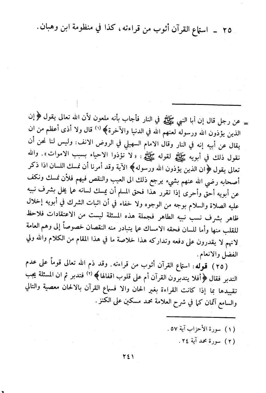 وَقَدْ ذَمَّ اللَّهُ - تَعَالَى - قَوْمًا عَلَى عَدَمِ التَّدَبُّرِ فَقَالَ {أَفَلا يَتَدَبَّرُونَ الْقُرْآنَ أَمْ عَلَى قُلُوبٍ أَقْفَالُهَا} [محمد: 24] فَتَدَبَّرْ ثُمَّ إنَّ الْمَسْأَلَةَ يَجِبُ تَقْيِيدُهَا بِمَا إذَا كَانَتْ الْقِرَاءَةُ بِغَيْرِ إلْحَانٍ وَإِلَّا فَسَمَاعُ الْقُرْآنِ بِالْإِلْحَانِ مَعْصِيَةٌ، وَالتَّالِي وَالسَّامِعُ آثِمَانِ كَمَا فِي شَرْحِ الْعَلَّامَة مُحَمَّدِ مِسْكِينٍ عَلَى الْكَنْزِ