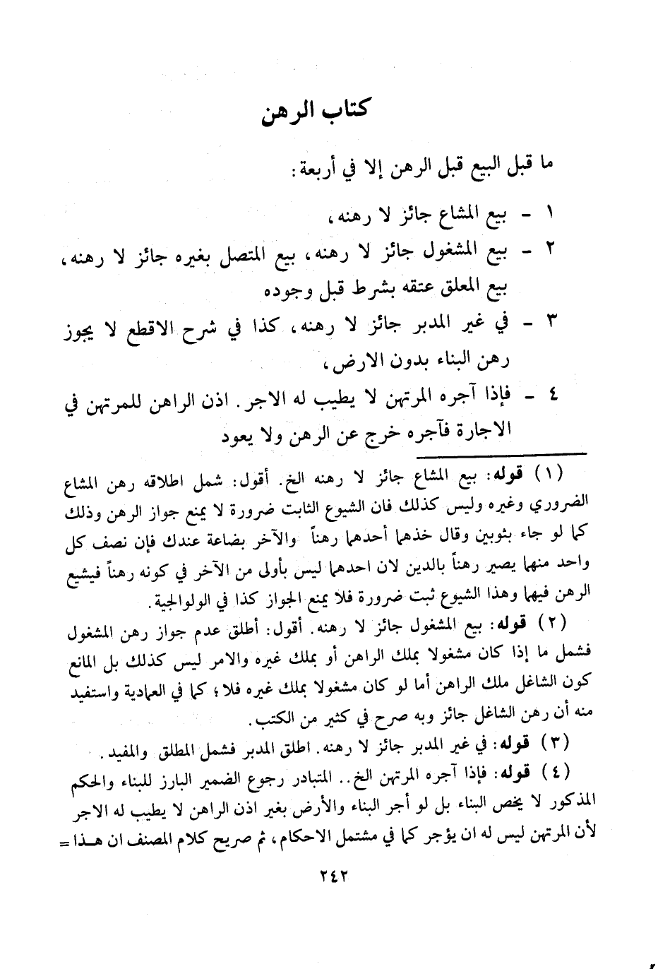 كِتَابُ الرَّهْنِ مَا قَبِلَ الْبَيْعَ قَبِلَ الرَّهْنَ إلَّا فِي أَرْبَعَةٍ: 1 - بَيْعُ الْمُشَاعِ جَائِزٌ لَا رَهْنُهُ،