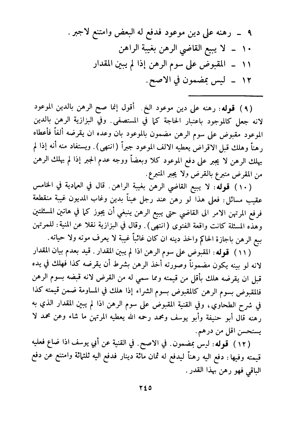 (11) قَوْلُهُ: الْمَقْبُوضُ عَلَى سَوْمِ الرَّهْنِ إذَا لَمْ يُبَيَّنْ الْمِقْدَارُ. قُيِّدَ بِعَدَمِ بَيَانِ الْمِقْدَارِ؛ لِأَنَّهُ لَوْ بَيَّنَهُ يَكُونُ مَضْمُونًا وَصُورَتُهُ: أَخَذَ الرَّهْنَ بِشَرْطِ أَنْ يُقْرِضَهُ كَذَا فَهَلَكَ فِي يَدِهِ قَبْلَ أَنْ يُقْرِضَهُ هَلَكَ بِأَقَلَّ مِنْ قِيمَتِهِ وَمِمَّا سُمِّيَ لَهُ مِنْ الْقَرْضِ؛ لِأَنَّهُ قَبَضَهُ بِسَوْمِ الرَّهْنِ فَالْمَقْبُوضُ بِسَوْمِ الرَّهْنِ كَالْمَقْبُوضِ بِسَوْمِ الشِّرَاءِ إذَا هَلَكَ فِي الْمُسَاوَمَةِ ضَمِنَ قِيمَتَهُ كَذَا فِي شَرْحِ الطَّحَاوِيِّ، وَفِي الْقُنْيَةِ: الْمَقْبُوضُ عَلَى سَوْمِ الرَّهْنِ إذَا لَمْ يُبَيِّنْ الْمِقْدَارَ الَّذِي بِهِ رَهَنَهُ قَالَ أَبُو حَنِيفَةَ وَأَبُو يُوسُفَ وَمُحَمَّدٌ - رَحِمَهُ اللَّهُ -: يُعْطِيهِ الْمُرْتَهِنُ مَا شَاءَ وَعَنْ مُحَمَّدٍ لَا يَسْتَحْسِنُ أَقَلَّ مِنْ دِرْهَمٍ.