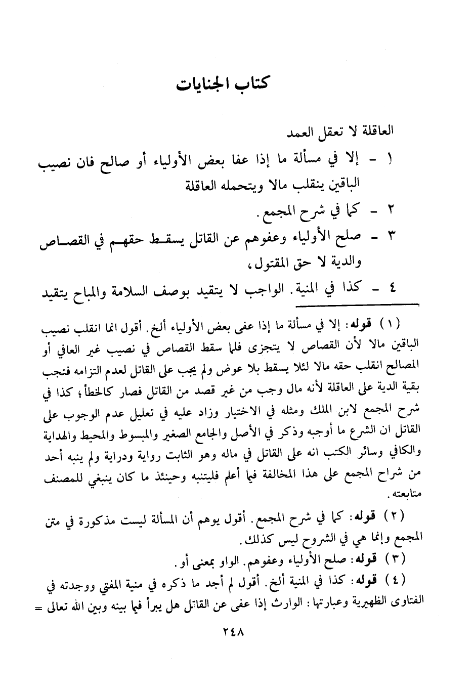 كِتَابُ الْجِنَايَاتِ الْعَاقِلَةُ لَا تَعْقِلُ الْعَمْدَ 1 - إلَّا فِي مَسْأَلَةِ مَا إذَا عَفَا بَعْضُ الْأَوْلِيَاءِ أَوْ صَالَحَ فَإِنَّ نَصِيبَ الْبَاقِينَ يَنْقَلِبُ مَالًا وَيَتَحَمَّلُهُ الْعَاقِلَةُ 2 - كَمَا فِي شَرْحِ الْمَجْمَعِ