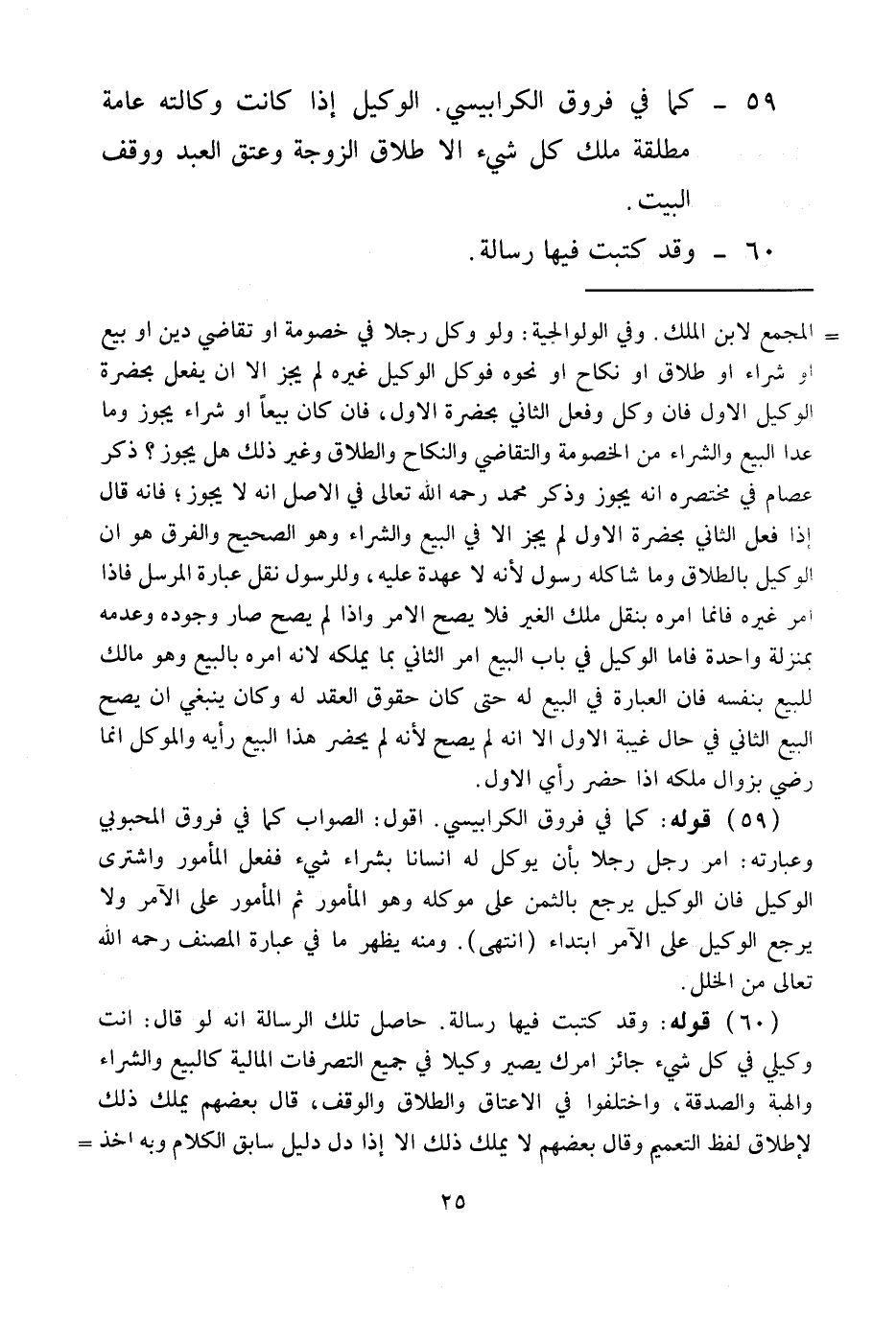 الْوَكِيلُ إذَا كَانَتْ وَكَالَتُهُ عَامَّةً مُطْلَقَةً مَلَكَ كُلَّ شَيْءٍ إلَّا طَلَاقَ الزَّوْجَةِ وَعِتْقَ الْعَبْدِ وَوَقْفَ الْبَيْتِ. 60 - وَقَدْ كَتَبْتُ فِيهَا رِسَالَةً.