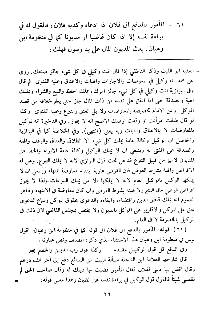 قَالَ شَارِحُهَا الْعَلَّامَةُ ابْنُ الشِّحْنَةِ مَسْأَلَةُ الْبَيْتِ مِنْ الْبَدَائِعِ دَفَعَ إلَى آخَرَ أَلْفَ دِرْهَمٍ وَقَالَ اقْضِ بِهَا دَيْنِي لِفُلَانٍ فَقَالَ الْمَأْمُورُ قَضَيْتُ بِهَا دَيْنَكَ لَهُ وَقَالَ صَاحِبُ الْحَقِّ لَمْ تَقْضِنِي شَيْئًا فَالْقَوْلُ قَوْلُ الْوَكِيلِ فِي بَرَاءَةِ نَفْسِهِ عَنْ الضَّمَانِ وَهَذَا مَعْنَى قَوْلِهِ: