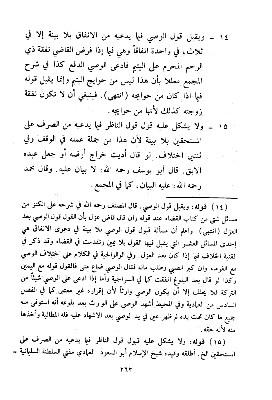 15 - وَلَا يُشْكِلُ عَلَيْهِ قَبُولُ قَوْلِ النَّاظِرِ فِيمَا يَدَّعِيهِ مِنْ الصَّرْفِ عَلَى الْمُسْتَحِقِّينَ بِلَا بَيِّنَةٍ؛ لِأَنَّ هَذَا مِنْ جُمْلَةِ عَمَلِهِ فِي الْوَقْفِ، وَفِي اثْنَتَيْنِ اخْتِلَافٌ.
