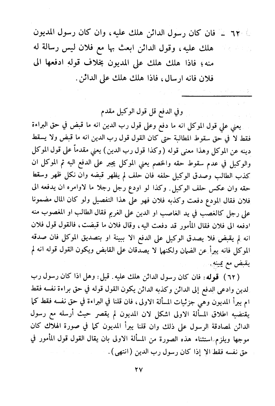 ـــــــــــــــــــــــــــــQوَفِي الدَّفْعِ قُلْ قَوْلُ الْوَكِيلِ مُقَدَّمٌ يَعْنِي عَلَى قَوْلِ الْمُوَكِّلِ أَنَّهُ مَا دَفَعَ وَعَلَى قَوْلِ رَبِّ الدَّيْنِ أَنَّهُ مَا قَبَضَ فِي حَقِّ الْبَرَاءَةِ فَقَطْ لَا فِي حَقِّ سُقُوطِ الْمُطَالَبَةِ حَتَّى كَانَ الْقَوْلُ قَوْلَ رَبِّ الدَّيْنِ أَنَّهُ مَا قَبَضَ وَلَا يَسْقُطُ دَيْنُهُ عَنْ الْمُوَكِّلِ وَهَذَا مَعْنَى قَوْلِهِ (وَكَذَا قَوْلُ رَبِّ الدَّيْنِ) يَعْنِي مُقَدَّمًا عَلَى قَوْلِ الْمُوَكِّلِ وَالْوَكِيلِ فِي عَدَمِ سُقُوطِ حَقِّهِ وَالْخَصْمُ يَعْنِي الْمُوَكِّلَ يُجْبَرُ عَلَى الدَّفْعِ إلَيْهِ ثُمَّ الْمُوَكِّلُ إنْ كَذَّبَ الطَّالِبَ وَصَدَّقَ الْوَكِيلَ حَلَّفَهُ فَإِنْ حَلَفَ لَمْ يَظْهَرْ قَبْضُهُ وَإِنْ نَكَلَ ظَهَرَ وَسَقَطَ حَقُّهُ وَإِنْ عَكَسَ حَلَّفَ الْوَكِيلَ.