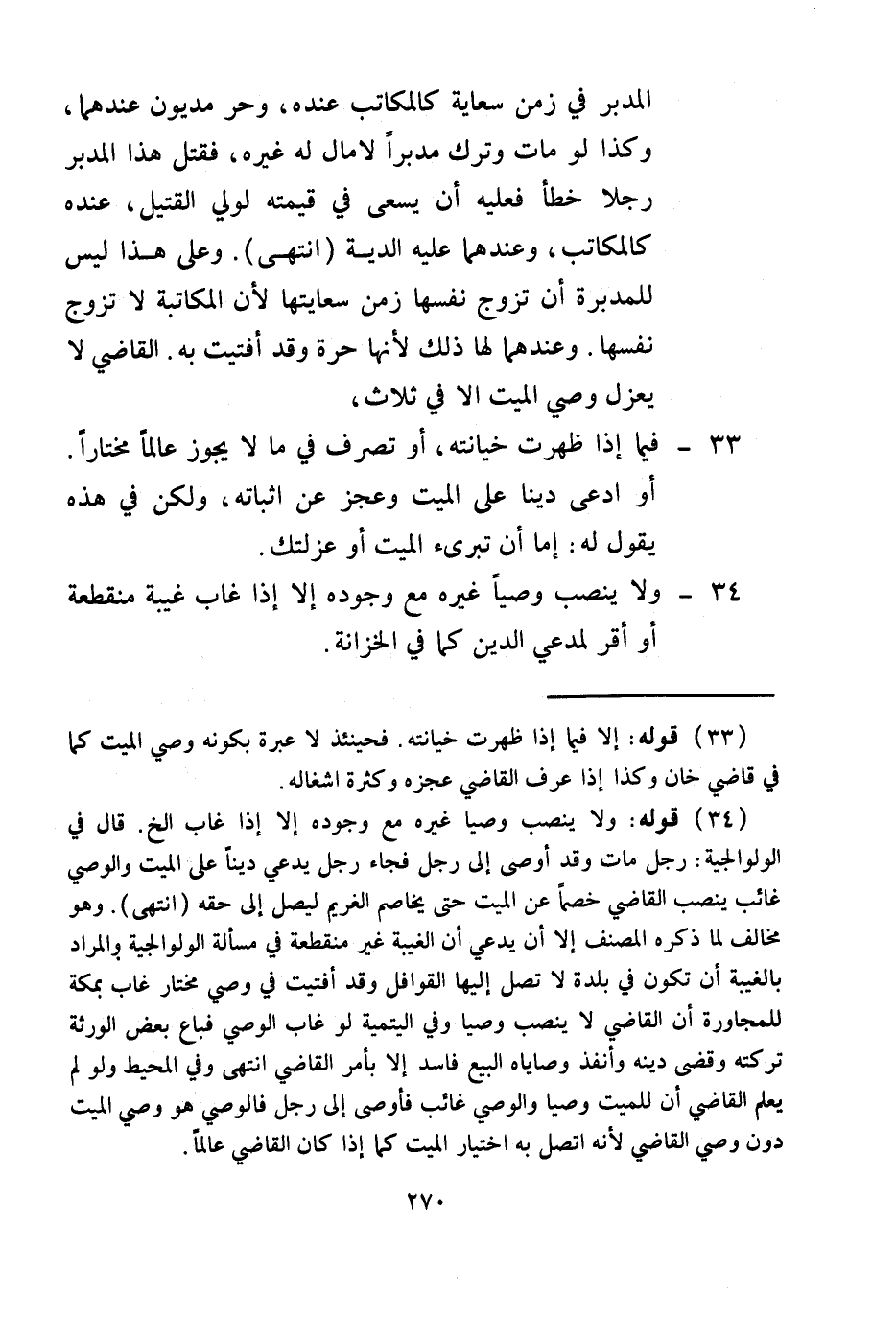 34 - وَلَا يُنَصِّبُ وَصِيًّا غَيْرَهُ مَعَ وُجُودِهِ إلَّا إذَا غَابَ غَيْبَةً مُنْقَطِعَةً أَوْ أَقَرَّ لِمُدَّعِي الدَّيْنِ كَمَا فِي الْخِزَانَةِ