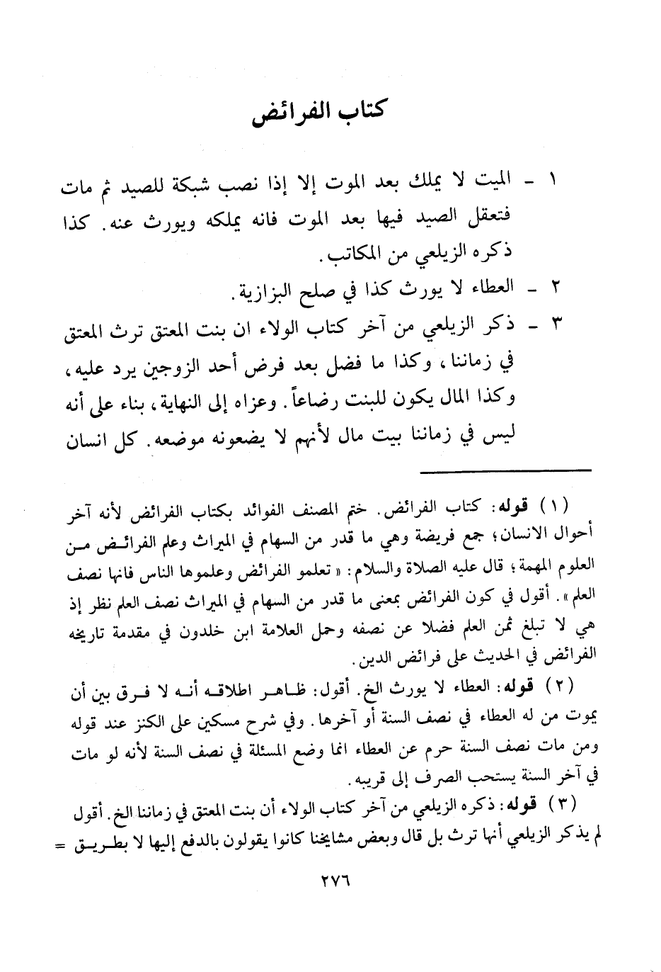 خَتَمَ الْمُصَنِّفُ الْفَوَائِدَ بِكِتَابِ الْفَرَائِضِ؛ لِأَنَّهُ آخِرُ أَحْوَالِ الْإِنْسَانِ؛ جَمْعُ فَرِيضَةٍ، وَهِيَ مَا قُدِّرَ مِنْ السِّهَامِ فِي الْمِيرَاثِ وَعِلْمُ الْفَرَائِضِ مِنْ الْعُلُومِ الْمُهِمَّةِ؛ قَالَ - عَلَيْهِ الصَّلَاةُ وَالسَّلَامُ -: «تَعَلَّمُوا الْفَرَائِضَ وَعَلِّمُوهَا النَّاسَ فَإِنَّهَا نِصْفُ الْعِلْمِ» . أَقُولُ: فِي كَوْنِ الْفَرَائِضِ بِمَعْنَى مَا قُدِّرَ مِنْ السِّهَامِ فِي الْمِيرَاثِ نِصْفَ الْعِلْمِ نَظَرٌ إذْ هِيَ لَا تَبْلُغُ ثُمُنَ الْعِلْمِ فَضْلًا عَنْ نِصْفِهِ وَحَمَلَ الْعَلَّامَةُ ابْنُ خَلْدُونٍ فِي مُقَدِّمَةِ تَارِيخِهِ الْفَرَائِضَ فِي الْحَدِيثِ عَلَى فَرَائِضِ الدِّينِ