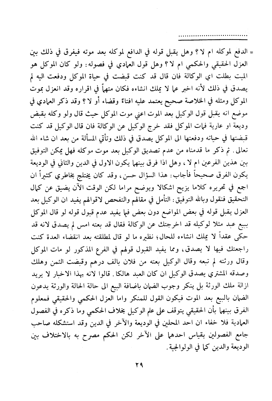 ـــــــــــــــــــــــــــــQالدَّفْعِ لِمُوَكِّلِهِ أَمْ لَا؟ وَهَلْ يُقْبَلُ قَوْلُهُ فِي الدَّفْعِ لِمُوَكِّلِهِ بَعْدَ مَوْتِهِ فَيُفَرَّقُ فِي ذَلِكَ بَيْنَ الْعَزْلِ الْحَقِيقِيِّ وَالْحُكْمِيِّ أَمْ لَا؟ وَهَلْ قَوْلُ الْعِمَادِيِّ فِي فُصُولِهِ: وَلَوْ كَانَ الْمُوَكِّلُ هُوَ الْمَيِّتَ بَطَلَتْ أَيْ الْوَكَالَةُ فَإِنْ قَالَ قَدْ كُنْتُ قَبَضْتُ فِي حَيَاةِ الْمُوَكِّلِ وَدَفَعْتُ إلَيْهِ لَمْ يُصَدَّقْ فِي ذَلِكَ لِأَنَّهُ أَخْبَرَ عَمَّا لَا يَمْلِكُ إنْشَاءَهُ فَكَانَ مُتَّهَمًا فِي إقْرَارِهِ وَقَدْ انْعَزَلَ بِمَوْتِ الْمُوَكِّلِ وَمِثْلُهُ فِي الْخُلَاصَةِ صَحِيحٌ يُعْتَمَدُ عَلَيْهِ إفْتَاءً وَقَضَاءً أَوْ لَا؟ وَقَدْ ذَكَرَ الْعِمَادِيُّ فِي مَوْضِعٍ أَنَّهُ يُقْبَلُ قَوْلُ الْوَكِيلِ بَعْدَ الْمَوْتِ أَعْنِي مَوْتَ الْمُوَكِّلِ حَيْثُ قَالَ وَلَوْ وَكَّلَهُ بِقَبْضِ وَدِيعَةٍ أَوْ عَارِيَّةٍ فَمَاتَ الْمُوَكِّلُ فَقَدْ خَرَجَ الْوَكِيلُ عَنْ الْوَكَالَةِ فَإِنْ قَالَ الْوَكِيلُ قَدْ كُنْتُ قَبَضْتُهَا فِي حَيَاتِهِ وَدَفَعْتُهَا إلَى الْمُوَكِّلِ يُصَدَّقُ فِي ذَلِكَ وَتَأْتِي الْمَسْأَلَةُ مِنْ بَعْدُ إنْ شَاءَ اللَّهُ تَعَالَى.