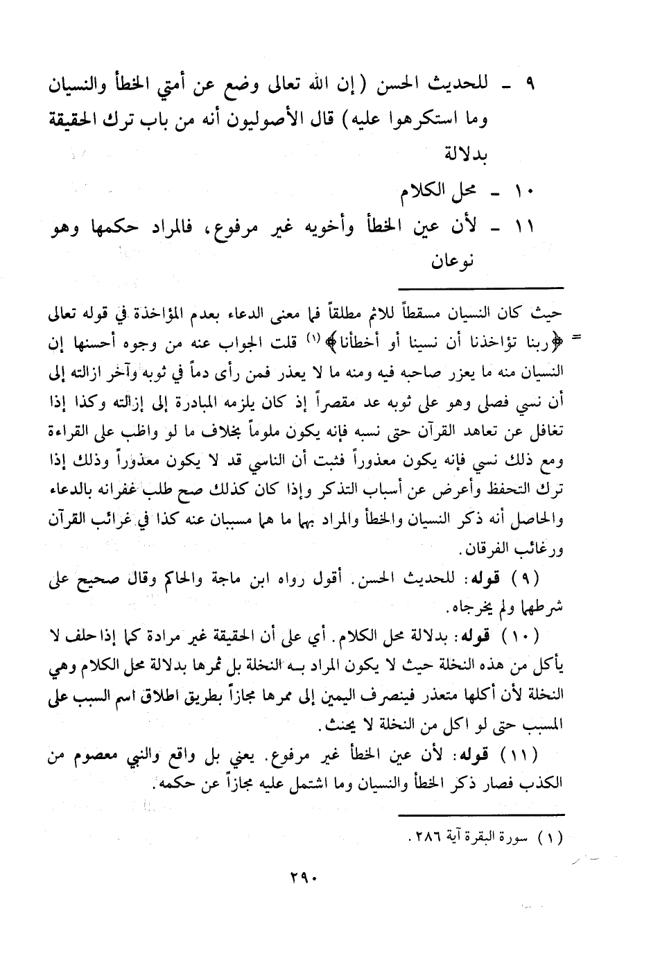 لِلْحَدِيثِ الْحَسَنِ «إنَّ اللَّهَ تَعَالَى وَضَعَ عَنْ أُمَّتِي الْخَطَأَ وَالنِّسْيَانَ، وَمَا اُسْتُكْرِهُوا عَلَيْهِ» قَالَ الْأُصُولِيُّونَ: إنَّهُ مِنْ بَابِ تَرْكِ الْحَقِيقَةِ بِدَلَالَةِ 10 - مَحَلِّ الْكَلَامِ 11 -؛ لِأَنَّ عَيْنَ الْخَطَأِ وَأَخَوَيْهِ غَيْرُ مَرْفُوعٍ، فَالْمُرَادُ حُكْمُهَا، وَهُوَ نَوْعَانِ