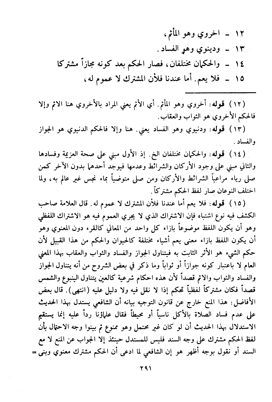 قَالَ الْعَلَّامَةُ صَاحِبُ الْكَشْفِ: فِيهِ نَوْعُ اشْتِبَاهٍ، فَإِنَّ الِاشْتِرَاكَ الَّذِي لَا يَجْرِي الْعُمُومُ فِيهِ هُوَ الِاشْتِرَاكُ اللَّفْظِيُّ، وَهُوَ أَنْ يَكُونَ اللَّفْظُ مَوْضُوعًا بِإِزَاءِ كُلِّ وَاحِدٍ مِنْ الْمَعَانِي كَالْقُرْءِ دُونَ الْمَعْنَوِيِّ، وَهُوَ أَنْ يَكُونَ اللَّفْظُ بِإِزَاءِ مَعْنًى يَعُمُّ أَشْيَاءَ مُخْتَلِفَةً كَالْحَيَوَانِ، وَالْحُكْمُ مِنْ هَذَا الْقَبِيلِ؛ لِأَنَّ حُكْمَ الشَّيْءِ هُوَ الْأَثَرُ الثَّابِتُ بِهِ فَيَتَنَاوَلُ الْجَوَازَ وَالْفَسَادَ وَالثَّوَابَ وَالْعِقَابَ بِهَذَا الْمَعْنَى الْعَامِّ لَا بِاعْتِبَارِ كَوْنِهِ جَوَازًا أَوْ ثَوَابًا، وَمَا ذُكِرَ فِي بَعْضِ الشُّرُوحِ مِنْ أَنَّهُ يَتَنَاوَلُ الْجَوَازَ وَالْفَسَادَ وَالثَّوَابَ وَالْإِثْمَ قَصْدًا؛ لِأَنَّ هَذِهِ أَحْكَامٌ شَرْعِيَّةٌ كَالْعَيْنِ يَتَنَاوَلُ الْيَنْبُوعَ وَالشَّمْسَ قَصْدًا فَكَانَ مُشْتَرَكًا لَفْظِيًّا تَحَكُّمٌ إذْ لَا نَقْلَ فِيهِ، وَلَا دَلِيلَ عَلَيْهِ (انْتَهَى) .