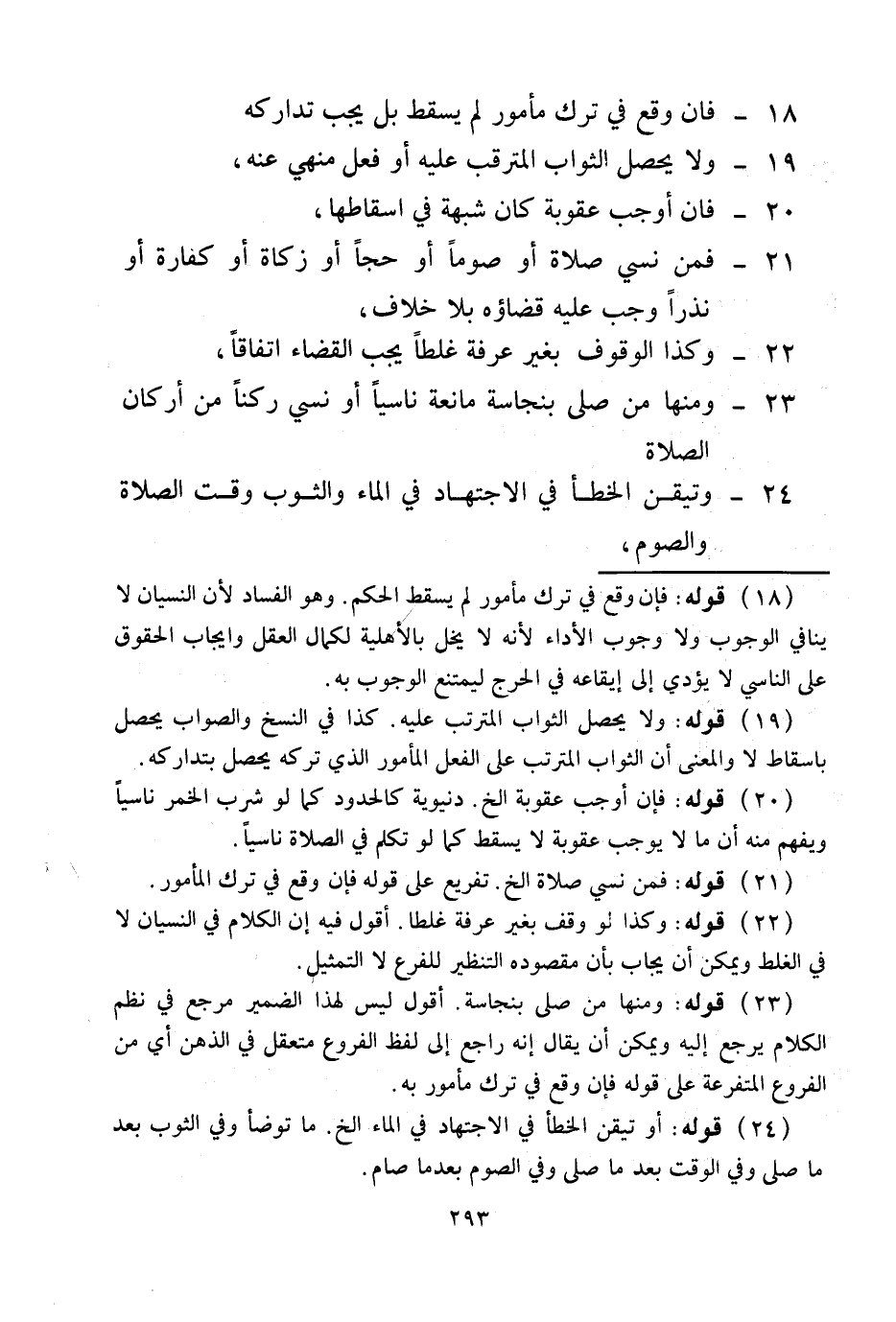 23 - وَمِنْهَا مَنْ صَلَّى بِنَجَاسَةٍ مَانِعَةٍ نَاسِيًا أَوْ نَسِيَ رُكْنًا مِنْ أَرْكَانِ الصَّلَاةِ 24 - وَتَيَقَّنَ الْخَطَأَ فِي الِاجْتِهَادِ فِي الْمَاءِ وَالثَّوْبِ وَقْتَ الصَّلَاةِ وَالصَّوْمِ،