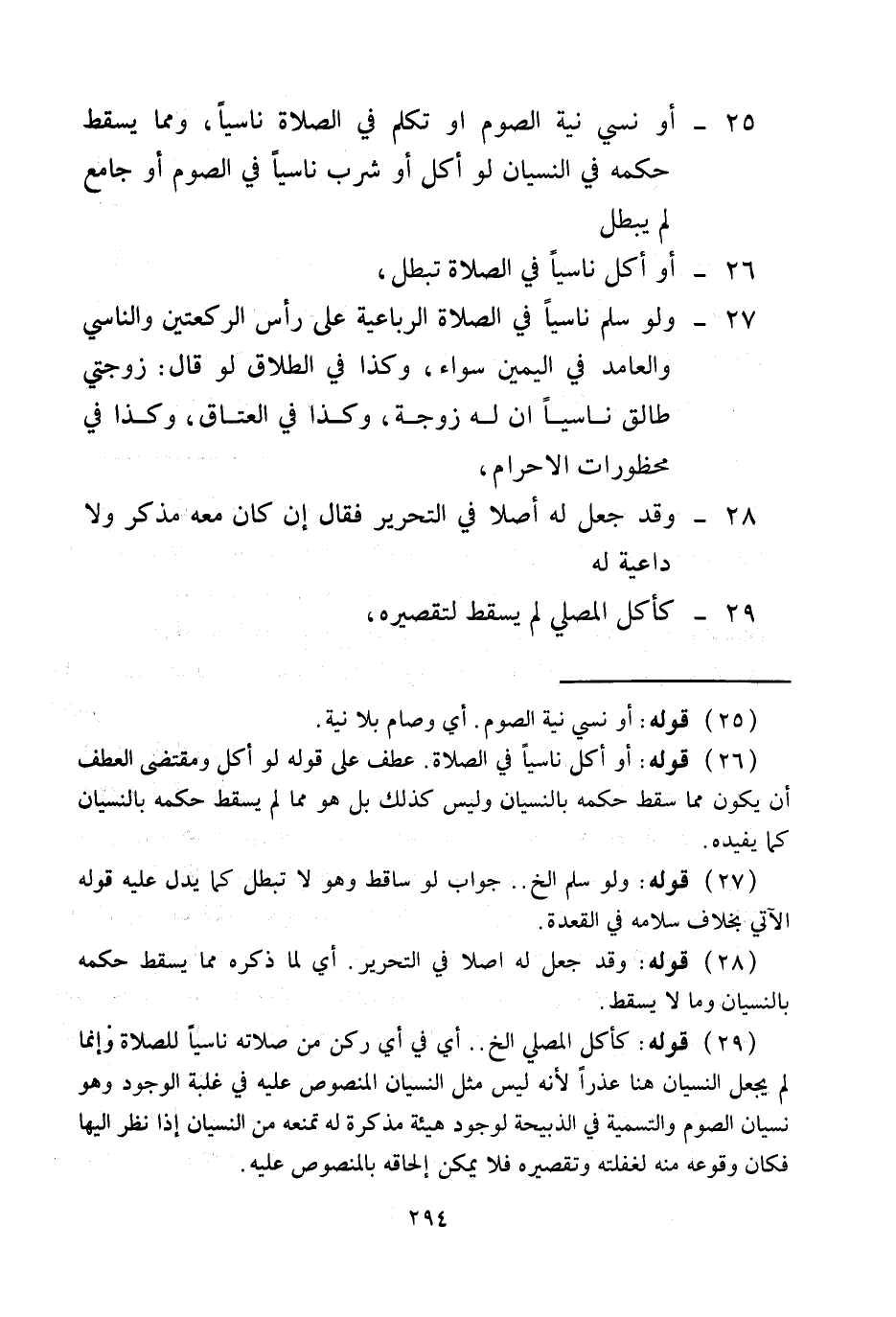 أَوْ نَسِيَ نِيَّةَ الصَّوْمِ أَوْ تَكَلَّمَ فِي الصَّلَاةِ نَاسِيًا وَمِمَّا يَسْقُطُ حُكْمُهُ فِي النِّسْيَانِ لَوْ أَكَلَ أَوْ شَرِبَ نَاسِيًا فِي الصَّوْمِ أَوْ جَامَعَ لَمْ يَبْطُلْ 26 - أَوْ أَكَلَ نَاسِيًا فِي الصَّلَاةِ تَبْطُلُ، 27 - وَلَوْ سَلَّمَ نَاسِيًا فِي الصَّلَاةِ الرُّبَاعِيَّةِ عَلَى رَأْسِ الرَّكْعَتَيْنِ