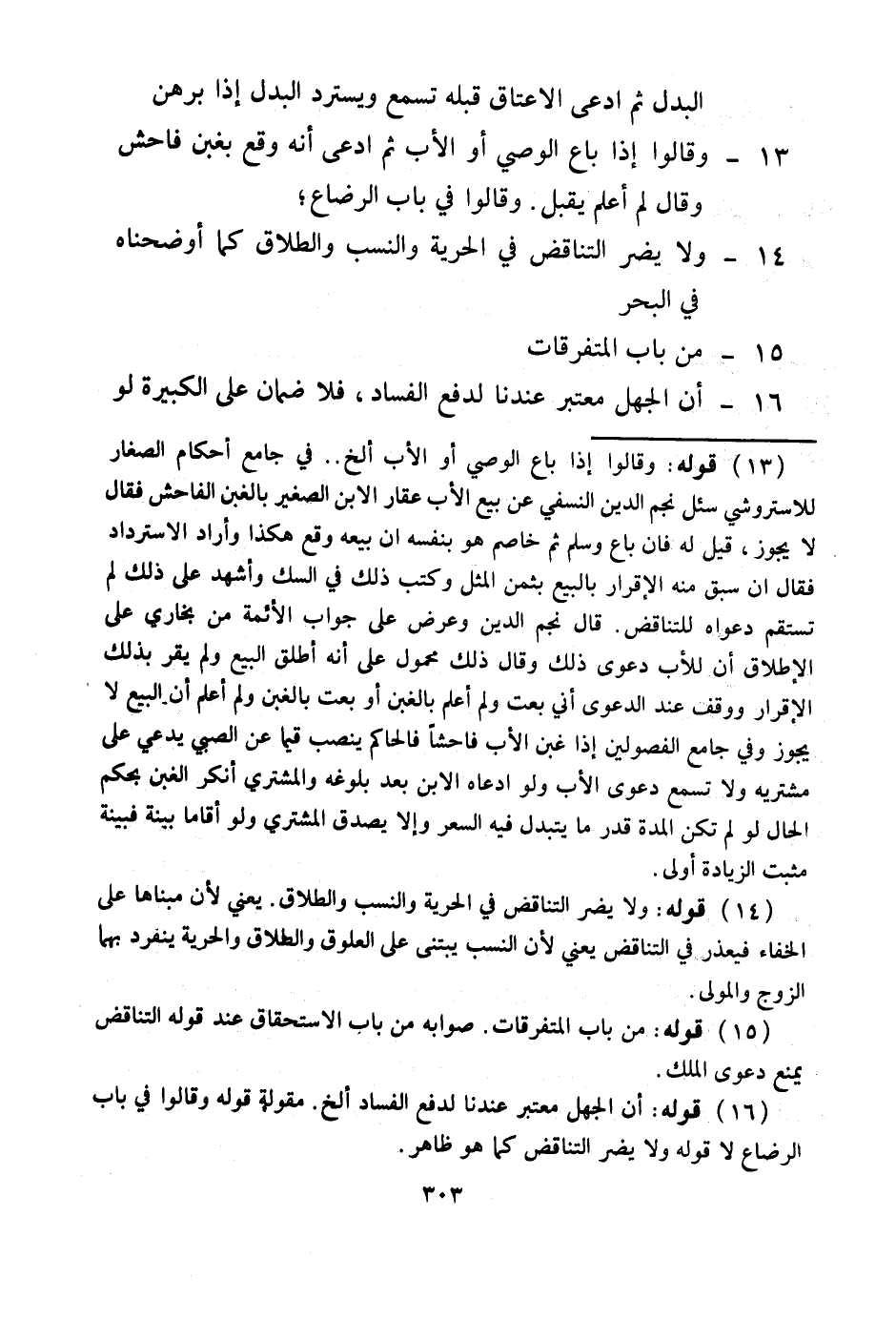 وَقَالُوا فِي بَابِ الرَّضَاعِ؛ 14 -: وَلَا يَضُرُّ التَّنَاقُضُ فِي الْحُرِّيَّةِ وَالنَّسَبِ وَالطَّلَاقِ كَمَا أَوْضَحْنَاهُ فِي الْبَحْرِ 15 - مِنْ بَابِ الْمُتَفَرِّقَاتِ 16 - أَنَّ الْجَهْلَ مُعْتَبَرٌ عِنْدَنَا لِدَفْعِ الْفَسَادِ، فَلَا ضَمَانَ عَلَى الْكَبِيرَةِ لَوْ