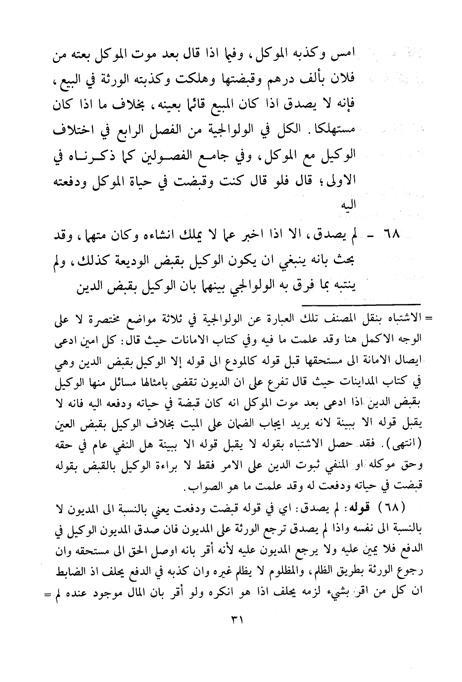 (68) قَوْلُهُ: لَمْ يُصَدَّقْ: أَيْ فِي قَوْلِهِ قَبَضْتُ وَدَفَعْتُ يَعْنِي بِالنِّسْبَةِ إلَى الْمَدْيُونِ لَا بِالنِّسْبَةِ إلَى نَفْسِهِ وَإِذَا لَمْ يُصَدَّقْ تَرْجِعُ الْوَرَثَةُ عَلَى الْمَدْيُونِ فَإِنْ صَدَّقَ الْمَدْيُونُ الْوَكِيلَ فِي الدَّفْعِ فَلَا يَمِينَ عَلَيْهِ وَلَا يَرْجِعُ الْمَدْيُونُ عَلَيْهِ لِأَنَّهُ أَقَرَّ بِأَنَّهُ أَوْصَلَ الْحَقَّ إلَى مُسْتَحِقِّهِ وَأَنَّ رُجُوعَ الْوَرَثَةِ بِطَرِيقِ الظُّلْمِ، وَالْمَظْلُومُ لَا يَظْلِمُ غَيْرَهُ وَإِنْ كَذَّبَهُ فِي الدَّفْعِ يُحَلَّفُ إذْ الضَّابِطُ أَنَّ كُلَّ مَنْ أَقَرَّ بِشَيْءٍ لَزِمَهُ يُحَلَّفُ إذَا هُوَ أَنْكَرَهُ وَلَوْ أَقَرَّ بِأَنَّ الْمَالَ مَوْجُودٌ عِنْدَهُ لَمْ