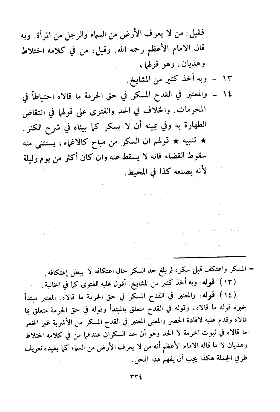 14 - وَالْمُعْتَبَرُ فِي الْقِدْحِ الْمُسْكِرِ فِي حَقِّ الْحُرْمَةِ مَا قَالَاهُ احْتِيَاطًا فِي الْمُحَرَّمَاتِ. وَالْخِلَافُ فِي الْحَدِّ وَالْفَتْوَى عَلَى قَوْلِهِمَا فِي انْتِقَاضِ الطَّهَارَةِ بِهِ وَفِي يَمِينِهِ أَنْ لَا يَسْكَرَ كَمَا بَيَّنَّاهُ فِي شَرْحِ الْكَنْزِ.