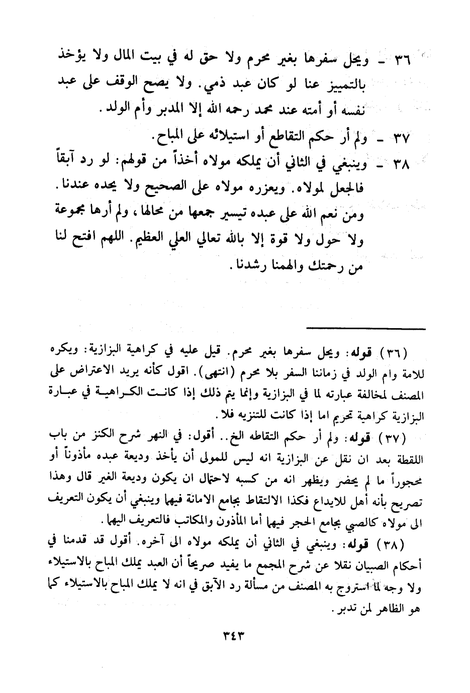 38 - وَيَنْبَغِي فِي الثَّانِي أَنْ يَمْلِكَهُ مَوْلَاهُ أَخْذًا مِنْ قَوْلِهِمْ: لَوْ رَدَّ آبِقًا فَالْجُعَلُ لِمَوْلَاهُ. وَيُعَزِّرُهُ مَوْلَاهُ عَلَى الصَّحِيحِ وَلَا يَحُدُّهُ عِنْدَنَا. وَمِنْ نِعَمِ اللَّهِ عَلَى عَبْدِهِ تَيْسِيرُ جَمْعِهَا مِنْ مَحَالِّهَا، وَلَمْ أَرَهَا مَجْمُوعَةً وَلَا حَوْلَ وَلَا قُوَّةَ إلَّا بِاَللَّهِ تَعَالَى الْعَلِيِّ الْعَظِيمِ. اللَّهُمَّ افْتَحْ لَنَا مِنْ رَحْمَتِكَ وَأَلْهِمْنَا رُشْدَنَا