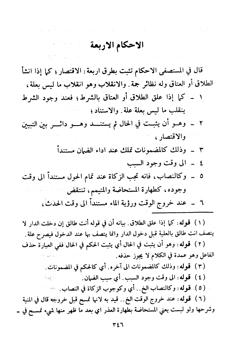 الْأَحْكَامُ الْأَرْبَعَةُ قَالَ فِي الْمُسْتَصْفَى: الْأَحْكَامُ تَثْبُتُ بِطُرُقٍ أَرْبَعَةٍ: الِاقْتِصَارُ؛ كَمَا إذَا أَنْشَأَ الطَّلَاقَ أَوْ الْعَتَاقَ وَلَهُ نَظَائِرُ جَمَّةٌ. وَالِانْقِلَابُ وَهُوَ انْقِلَابُ مَا لَيْسَ بِعِلَّةٍ،
