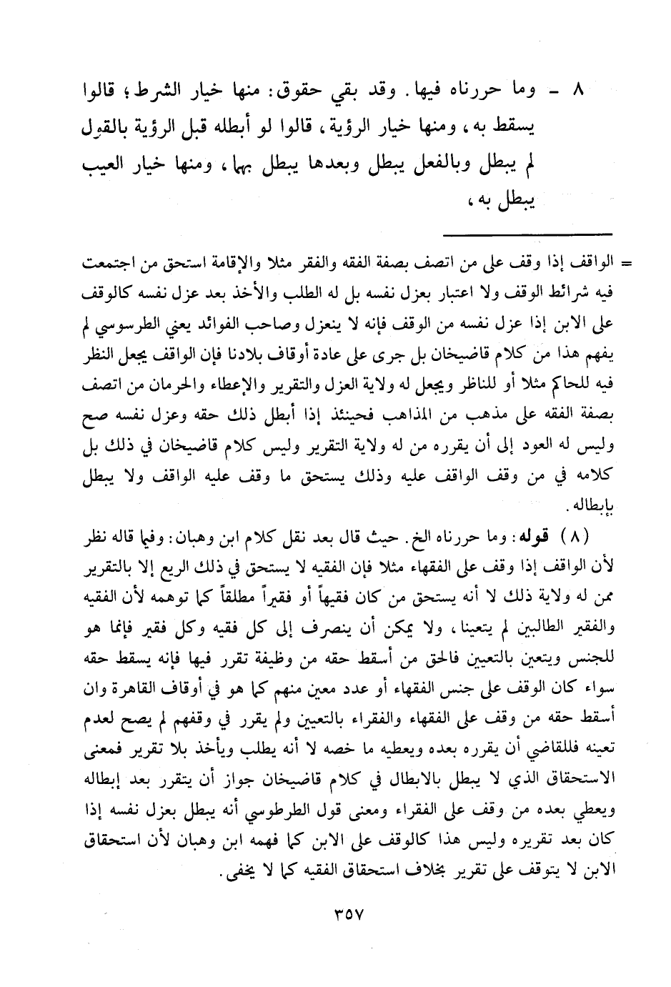 (8) قَوْله: وَمَا حَرَّرْنَاهُ إلَخْ. حَيْثُ قَالَ بَعْدَ نَقْلِ كَلَامِ ابْنِ وَهْبَانَ: وَفِيمَا قَالَهُ نَظَرٌ لِأَنَّ الْوَاقِفَ إذَا وَقَفَ عَلَى الْفُقَهَاءِ مَثَلًا فَإِنَّ الْفَقِيهَ لَا يَسْتَحِقُّ فِي ذَلِكَ الرِّيعَ إلَّا بِالتَّقْرِيرِ مِمَّنْ لَهُ وِلَايَةُ ذَلِكَ لَا أَنَّهُ يَسْتَحِقُّ مَنْ كَانَ فَقِيهًا أَوْ فَقِيرًا مُطْلَقًا كَمَا تَوَهَّمَهُ لِأَنَّ الْفَقِيهَ وَالْفَقِيرَ الطَّالِبَيْنِ لَمْ يَتَعَيَّنَا، وَلَا يُمْكِنُ أَنْ يَنْصَرِفَ إلَى كُلِّ فَقِيهٍ وَكُلِّ فَقِيرٍ فَإِنَّمَا هُوَ لِلْجِنْسِ وَيَتَعَيَّنُ بِالتَّعْيِينِ فَالْحَقُّ مَنْ أَسْقَطَ حَقَّهُ مِنْ وَظِيفَةٍ تَقَرَّرَ فِيهَا، فَإِنَّهُ يَسْقُطُ حَقُّهُ سَوَاءٌ كَانَ الْوَقْفُ عَلَى جِنْسِ الْفُقَهَاءِ أَوْ عَدَدٍ مُعَيَّنٍ مِنْهُمْ كَمَا هُوَ فِي أَوْقَافِ الْقَاهِرَةِ، وَإِنْ أَسْقَطَ حَقَّهُ مَنْ وَقَفَ عَلَى الْفُقَهَاءِ وَالْفُقَرَاءِ بِالتَّعْيِينِ وَلَمْ يُقَرِّرْ فِي وَقْفِهِمْ لَمْ يَصِحَّ لِعَدَمِ تَعَيُّنِهِ فَلِلْقَاضِي أَنْ يُقَرِّرَهُ بَعْدَهُ وَيُعْطِيَهُ مَا خَصَّهُ لَا أَنَّهُ يَطْلُبُ وَيَأْخُذُ بِلَا تَقْرِيرٍ، فَمَعْنَى الِاسْتِحْقَاقِ الَّذِي لَا يَبْطُلُ بِالْإِبْطَالِ فِي كَلَامِ قَاضِي خَانْ جَوَازُ أَنْ يَتَقَرَّرَ بَعْدَ إبْطَالِهِ وَيُعْطِيَ بَعْدَهُ مَنْ وَقَفَ عَلَى الْفُقَرَاءِ، وَمَعْنَى قَوْلِ الطَّرَسُوسِيِّ أَنَّهُ يَبْطُلُ بِعَزْلِ نَفْسِهِ إذَا كَانَ بَعْدَ تَقْرِيرِهِ، وَلَيْسَ هَذَا كَالْوَقْفِ عَلَى الِابْنِ كَمَا فَهِمَهُ ابْنُ وَهْبَانَ لِأَنَّ اسْتِحْقَاقَ الِابْنِ لَا يَتَوَقَّفُ عَلَى تَقْرِيرٍ بِخِلَافِ اسْتِحْقَاقِ الْفَقِيهِ كَمَا لَا يُخْفَى