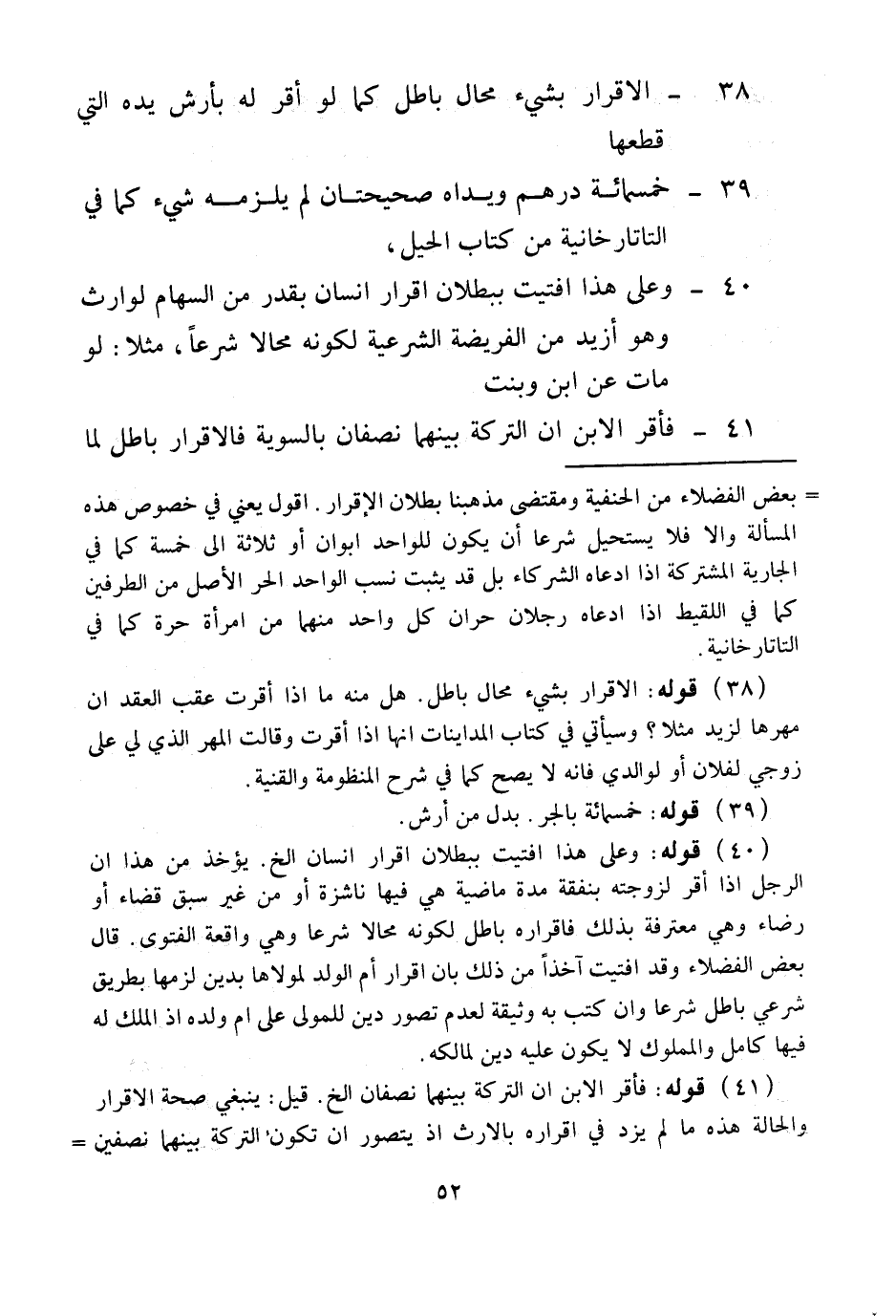 الْإِقْرَارُ بِشَيْءٍ مُحَالٍ بَاطِلٌ كَمَا لَوْ أَقَرَّ لَهُ بِأَرْشِ يَدِهِ الَّتِي قَطَعَهَا 39 - خَمْسِمِائَةِ دِرْهَمٍ وَيَدَاهُ صَحِيحَتَانِ لَمْ يَلْزَمْهُ شَيْءٌ كَمَا فِي التَّتَارْخَانِيَّة مِنْ كِتَابِ الْحِيَلِ 40 - وَعَلَى هَذَا أَفْتَيْتُ بِبُطْلَانِ إقْرَارِ إنْسَانٍ بِقَدْرٍ مِنْ السِّهَامِ لِوَارِثٍ وَهُوَ أَزْيَدُ مِنْ الْفَرِيضَةِ الشَّرْعِيَّةِ لِكَوْنِهِ مُحَالًا شَرْعًا، مَثَلًا: لَوْ مَاتَ عَنْ ابْنٍ وَبِنْتٍ. 41 - فَأَقَرَّ الِابْنُ أَنَّ التَّرِكَةَ بَيْنَهُمَا نِصْفَانِ بِالسَّوِيَّةِ فَالْإِقْرَارُ بَاطِلٌ لِمَا