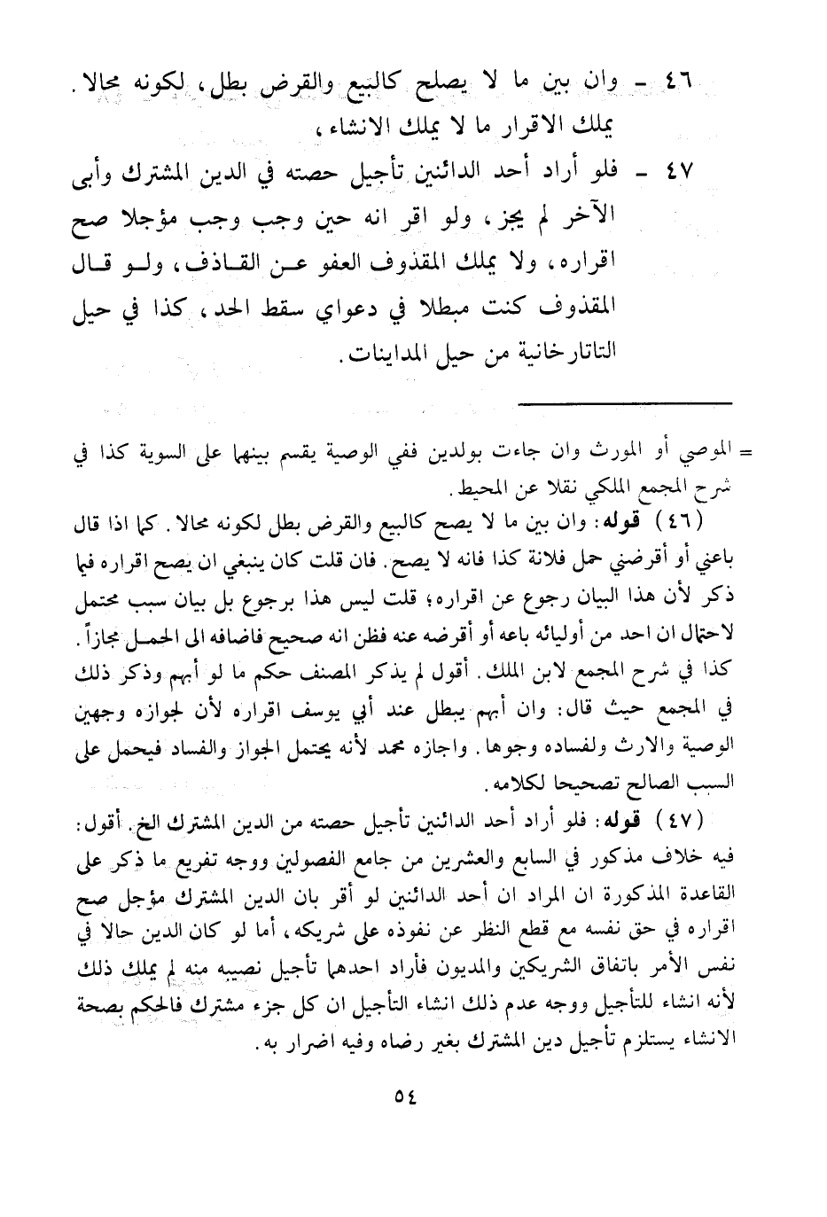 أَقُولُ: فِيهِ خِلَافٌ مَذْكُورٌ فِي السَّابِعِ وَالْعِشْرِينَ مِنْ جَامِعِ الْفُصُولَيْنِ وَوَجْهُ تَفْرِيعِ مَا ذَكَرَ عَلَى الْقَاعِدَةِ الْمَذْكُورَةِ أَنَّ الْمُرَادَ أَنَّ أَحَدَ الدَّائِنَيْنِ لَوْ أَقَرَّ بِأَنَّ الدَّيْنَ الْمُشْتَرَكَ مُؤَجَّلٌ صَحَّ إقْرَارُهُ فِي حَقِّ نَفْسِهِ مَعَ قَطْعِ النَّظَرِ عَنْ نُفُوذِهِ عَلَى شَرِيكِهِ، أَمَّا لَوْ كَانَ الدَّيْنُ حَالًّا فِي نَفْسِ الْأَمْرِ بِاتِّفَاقِ الشَّرِيكَيْنِ وَالْمَدْيُونِ فَأَرَادَ أَحَدُهُمَا تَأْجِيلَ نَصِيبِهِ مِنْهُ لَمْ يَمْلِكْ ذَلِكَ لِأَنَّهُ إنْشَاءٌ لِلتَّأْجِيلِ وَوَجْهُ عَدَمِ ذَلِكَ إنْشَاءِ التَّأْجِيلِ أَنَّ كُلَّ جُزْءٍ مُشْتَرَكٍ فَالْحُكْمُ بِصِحَّةِ الْإِنْشَاءِ يَسْتَلْزِمُ تَأْجِيلَ دَيْنِ الْمُشْتَرَكِ بِغَيْرِ رِضَاهُ وَفِيهِ إضْرَارٌ بِهِ