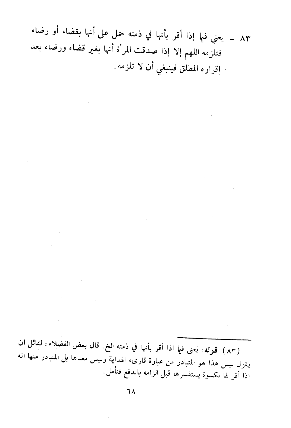 يَعْنِي فِيمَا إذَا أَقَرَّ بِأَنَّهَا فِي ذِمَّتِهِ حُمِلَ عَلَى أَنَّهَا بِقَضَاءٍ أَوْ رِضَاءٍ فَتَلْزَمُهُ اللَّهُمَّ إلَّا إذَا صَدَّقَتْ الْمَرْأَةُ أَنَّهَا بِغَيْرِ قَضَاءٍ وَرِضَاءٍ بَعْدَ إقْرَارِهِ الْمُطْلَقِ فَيَنْبَغِي أَنْ لَا تَلْزَمَهُ.