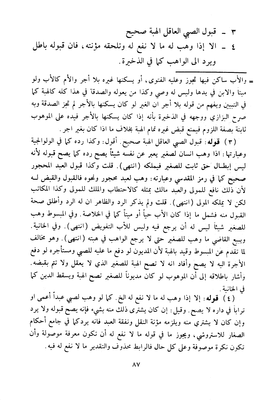 قَبُولُ الصَّبِيِّ الْعَاقِلِ الْهِبَةَ صَحِيحٌ 4 - إلَّا إذَا وَهَبَ لَهُ مَا لَا نَفْعَ لَهُ وَتَلْحَقُهُ مُؤْنَتُهُ، فَإِنَّ قَبُولَهُ بَاطِلٌ وَيُرَدُّ إلَى الْوَاهِبِ كَمَا فِي الذَّخِيرَةِ.