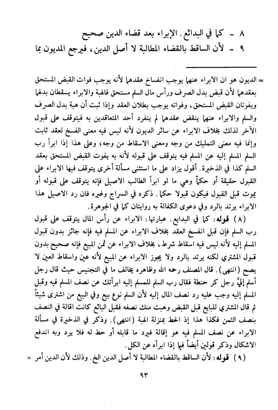عِبَارَتُهَا: الْإِبْرَاءُ عَنْ رَأْسِ الْمَالِ يَتَوَقَّفُ عَلَى قَبُولِ رَبِّ السَّلَمِ فَإِنْ قَبِلَ انْفَسَخَ الْعَقْدُ بِخِلَافِ الْإِبْرَاءِ عَنْ الْمُسْلَمِ فِيهِ فَإِنَّهُ جَائِزٌ بِدُونِ قَبُولِ الْمُسْلَمِ إلَيْهِ؛ لِأَنَّهُ لَيْسَ فِيهِ إسْقَاطُ شَرْطٍ، بِخِلَافِ الْإِبْرَاءِ عَنْ ثَمَنِ الْمَبِيعِ فَإِنَّهُ صَحِيحٌ بِدُونِ قَبُولِ الْمُشْتَرِي لَكِنَّهُ يَرْتَدُّ بِالرَّدِّ وَلَا يَجُوزُ الْإِبْرَاءُ عَنْ الْمَبِيعِ؛ لِأَنَّهُ عَيْنٌ وَإِسْقَاطُ الْعَيْنِ لَا يَصِحُّ (انْتَهَى) .