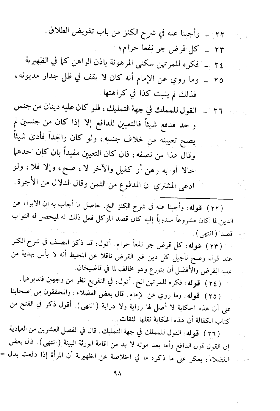 23 - كُلُّ قَرْضٍ جَرَّ نَفْعًا حَرَامٌ؛ 24 - فَكُرِهَ لِلْمُرْتَهِنِ سُكْنَى الْمَرْهُونَةِ بِإِذْنِ الرَّاهِنِ كَمَا فِي الظَّهِيرِيَّةِ 25 - وَمَا رُوِيَ عَنْ الْإِمَامِ أَنَّهُ كَانَ لَا يَقِفُ فِي ظِلِّ جِدَارِ مَدْيُونِهِ، فَذَلِكَ لَمْ يَثْبُتْ كَذَا فِي كَرَاهَتِهَا