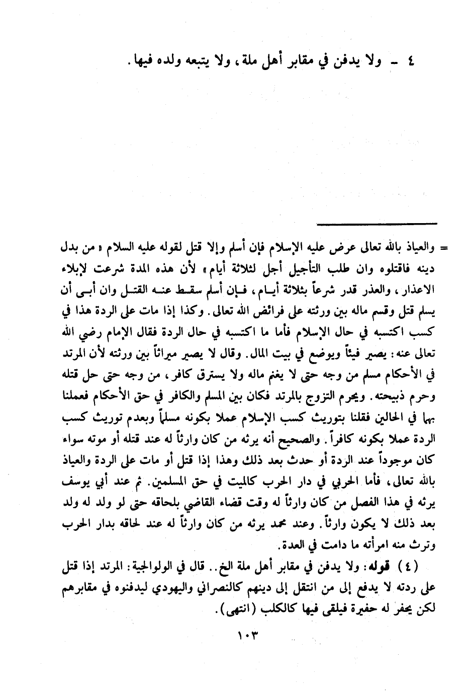 (4) قَوْلُهُ: وَلَا يُدْفَنُ فِي مَقَابِرِ أَهْلِ مِلَّةٍ إلَخْ. قَالَ فِي الْوَلْوَالِجيَّةِ: الْمُرْتَدُّ إذَا قُتِلَ عَلَى رِدَّتِهِ لَا يُدْفَعُ إلَى مَنْ انْتَقَلَ إلَى دِينِهِمْ كَالنَّصْرَانِيِّ وَالْيَهُودِيِّ لِيَدْفِنُوهُ فِي مَقَابِرِهِمْ لَكِنْ يُحْفَرُ لَهُ حُفْرَةً فَيُلْقَى فِيهَا كَالْكَلْبِ (انْتَهَى) .