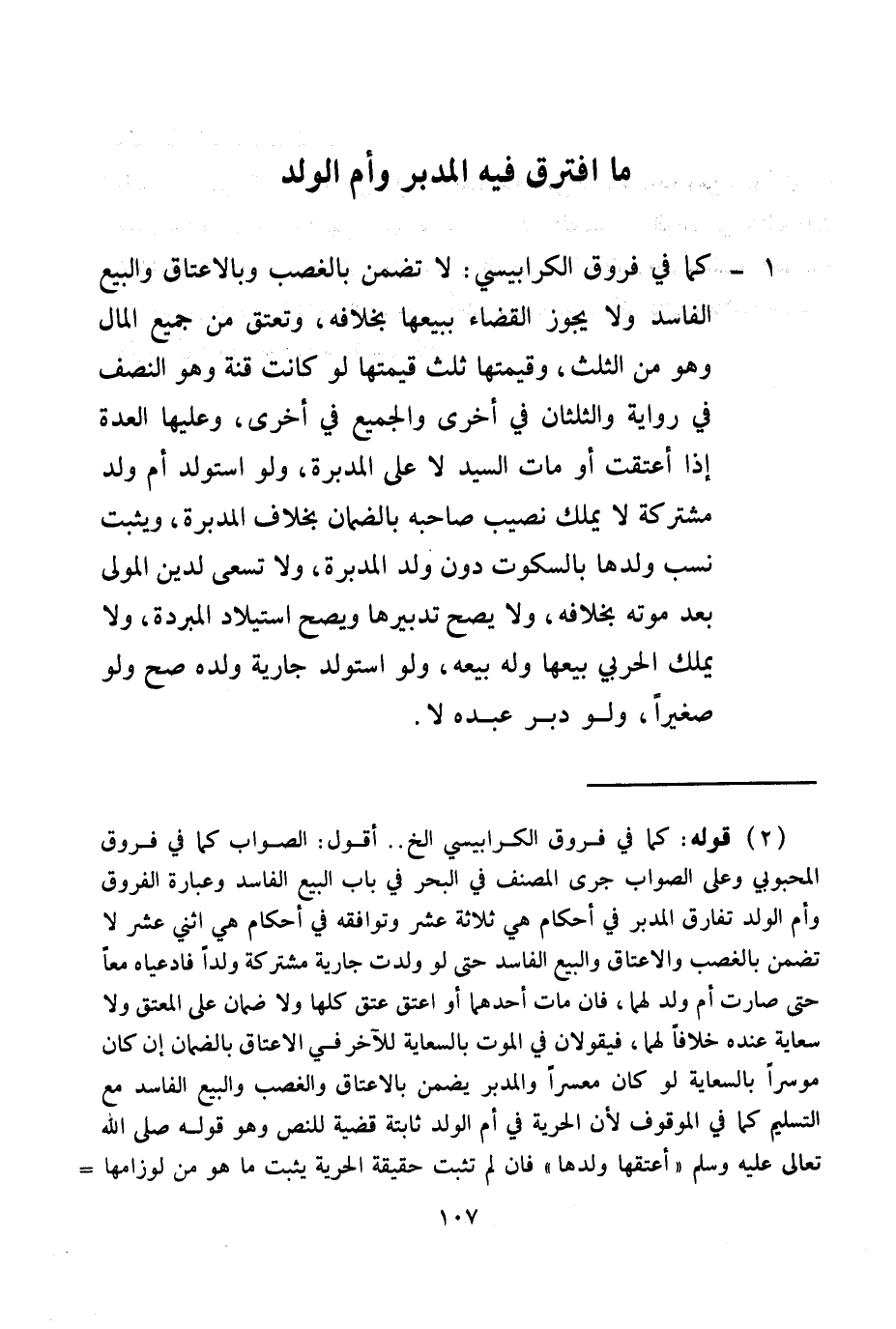مَا افْتَرَقَ فِيهِ الْمُدَبَّرُ وَأُمُّ الْوَلَدِ 1 - كَمَا فِي فُرُوقِ الْكَرَابِيسِيِّ: لَا تُضَمَّنُ بِالْغَصْبِ وَبِالْإِعْتَاقِ وَالْبَيْعِ الْفَاسِدِ وَلَا يَجُوزُ الْقَضَاءُ بِبَيْعِهَا بِخِلَافِهِ، وَتُعْتَقُ مِنْ جَمِيعِ الْمَالِ وَهُوَ مِنْ الثُّلُثِ، وَقِيمَتُهَا ثُلُثُ قِيمَتِهَا لَوْ كَانَتْ قِنَّةً وَهُوَ النِّصْفُ فِي رِوَايَةٍ وَالثُّلُثَانِ فِي أُخْرَى وَالْجَمِيعُ فِي أُخْرَى، وَعَلَيْهَا الْعِدَّةُ إذَا أُعْتِقَتْ أَوْ مَاتَ السَّيِّدُ لَا عَلَى الْمُدَبَّرَةِ، وَلَوْ اسْتَوْلَدَ أُمَّ وَلَدٍ مُشْتَرَكَةٍ لَا يَمْلِكُ نَصِيبَ صَاحِبِهِ بِالضَّمَانِ بِخِلَافِ الْمُدَبَّرَةِ، وَيَثْبُتُ نَسَبُ وَلَدِهَا بِالسُّكُوتِ دُونَ وَلَدِ الْمُدَبَّرَةِ، وَلَا تَسْعَى لِدَيْنِ الْمَوْلَى بَعْدَ مَوْتِهِ بِخِلَافِهِ، وَلَا يَصِحُّ تَدْبِيرُهَا وَيَصِحُّ اسْتِيلَادُ الْمُدَبَّرَةِ، وَلَا يَمْلِكُ الْحَرْبِيُّ بَيْعَهَا وَلَهُ بَيْعُهُ، وَلَوْ اسْتَوْلَدَ جَارِيَةَ وَلَدِهِ صَحَّ وَلَوْ صَغِيرًا، وَلَوْ دَبَّرَ عَبْدَهُ لَا
