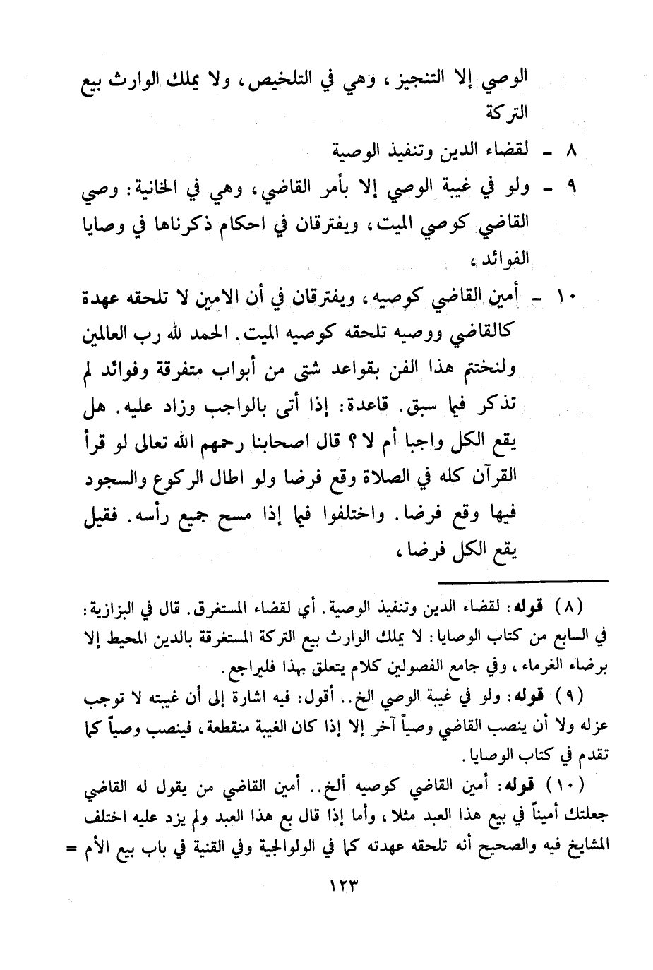 10 - أَمِينُ الْقَاضِي كَوَصِيِّهِ، وَيَفْتَرِقَانِ فِي أَنَّ الْأَمِينَ لَا تَلْحَقُهُ عُهْدَةٌ كَالْقَاضِي وَوَصِيُّهُ تَلْحَقُهُ كَوَصِيِّ الْمَيِّتِ. الْحَمْدُ لِلَّهِ رَبِّ الْعَالَمِينَ وَلْنَخْتَتِمْ هَذَا الْفَنَّ بِقَوَاعِدَ شَتَّى مِنْ أَبْوَابٍ مُتَفَرِّقَةٍ وَفَوَائِدَ لَمْ تُذْكَرْ فِيمَا سَبَقَ.