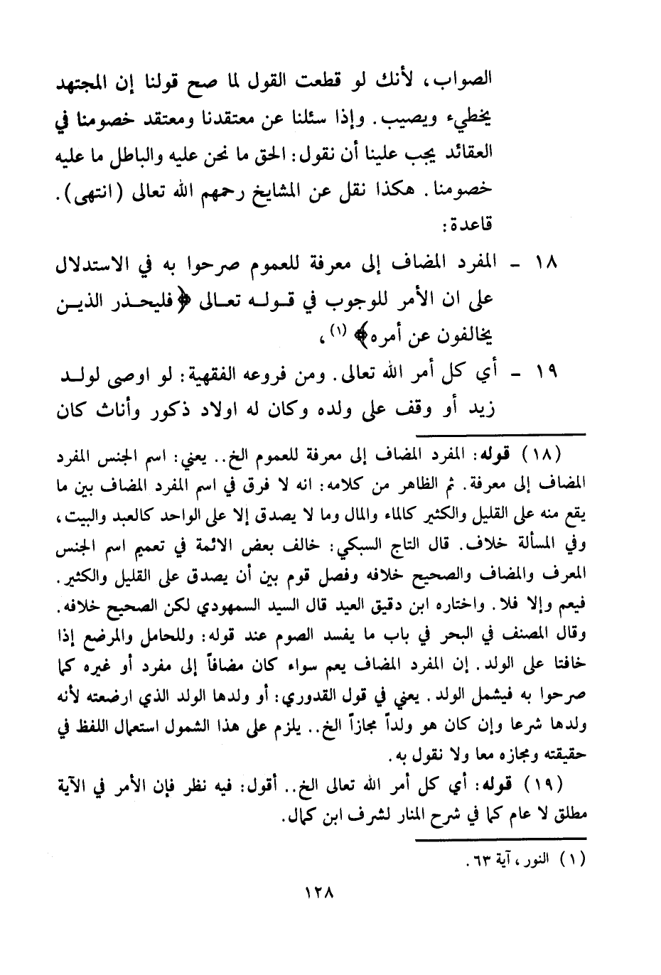 18 - الْمُفْرَدُ الْمُضَافُ إلَى مَعْرِفَةٍ لِلْعُمُومِ صَرَّحُوا بِهِ فِي الِاسْتِدْلَالِ عَلَى أَنَّ الْأَمْرَ لِلْوُجُوبِ فِي قَوْله تَعَالَى {فَلْيَحْذَرِ الَّذِينَ يُخَالِفُونَ عَنْ أَمْرِهِ} [النور: 63] .
