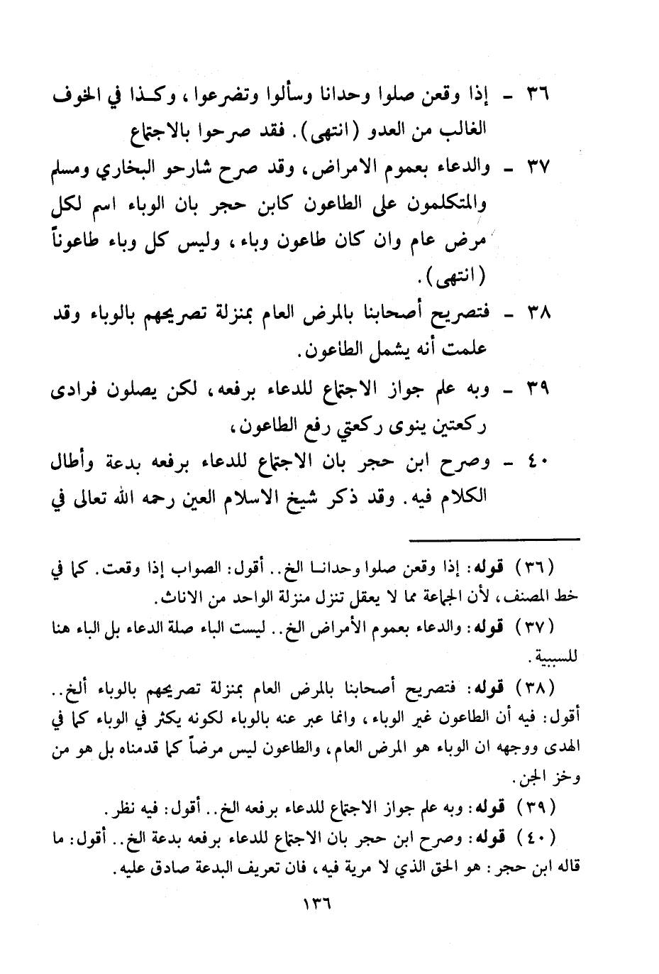 39 - وَبِهِ عُلِمَ جَوَازُ الِاجْتِمَاعِ لِلدُّعَاءِ بِرَفْعِهِ، لَكِنْ يُصَلُّونَ فُرَادَى رَكْعَتَيْنِ يَنْوِي رَكْعَتَيْ رَفْعِ الطَّاعُونِ.