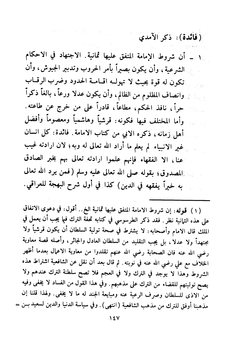 فَائِدَةٌ) : ذَكَرَ الْآمِدِيُّ 1 - أَنَّ شُرُوطَ الْإِمَامَةِ الْمُتَّفَقَ عَلَيْهَا ثَمَانِيَةٌ: